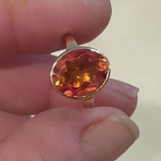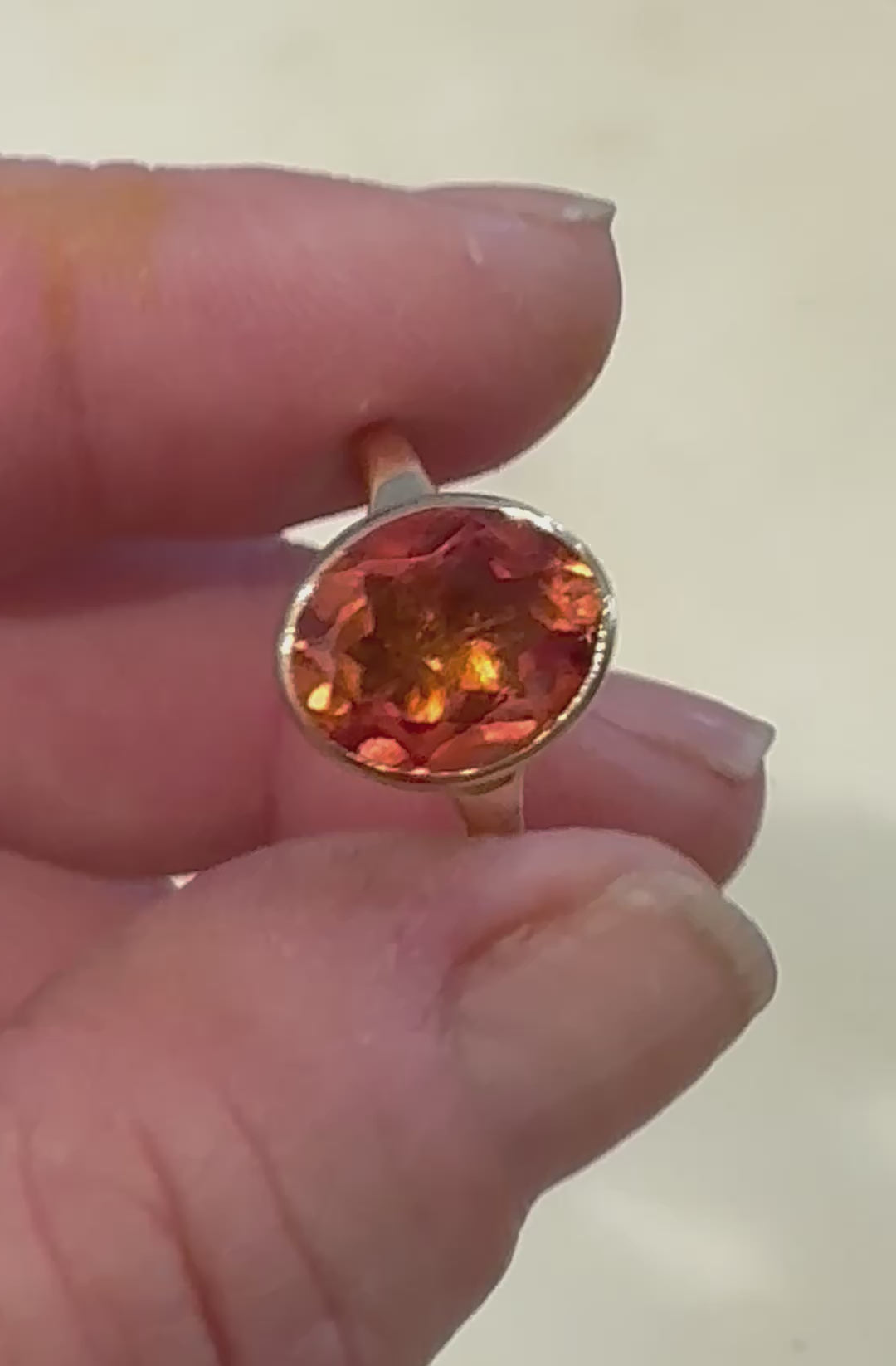 A lovely modernist ring I purchased in Bergen, Norway, currently size 7.5 but easily sized up or down. The hand made 14k gold ring weighs 4.75 grams and contains a bezel set orange quartz stone. Looks beautiful stacked!