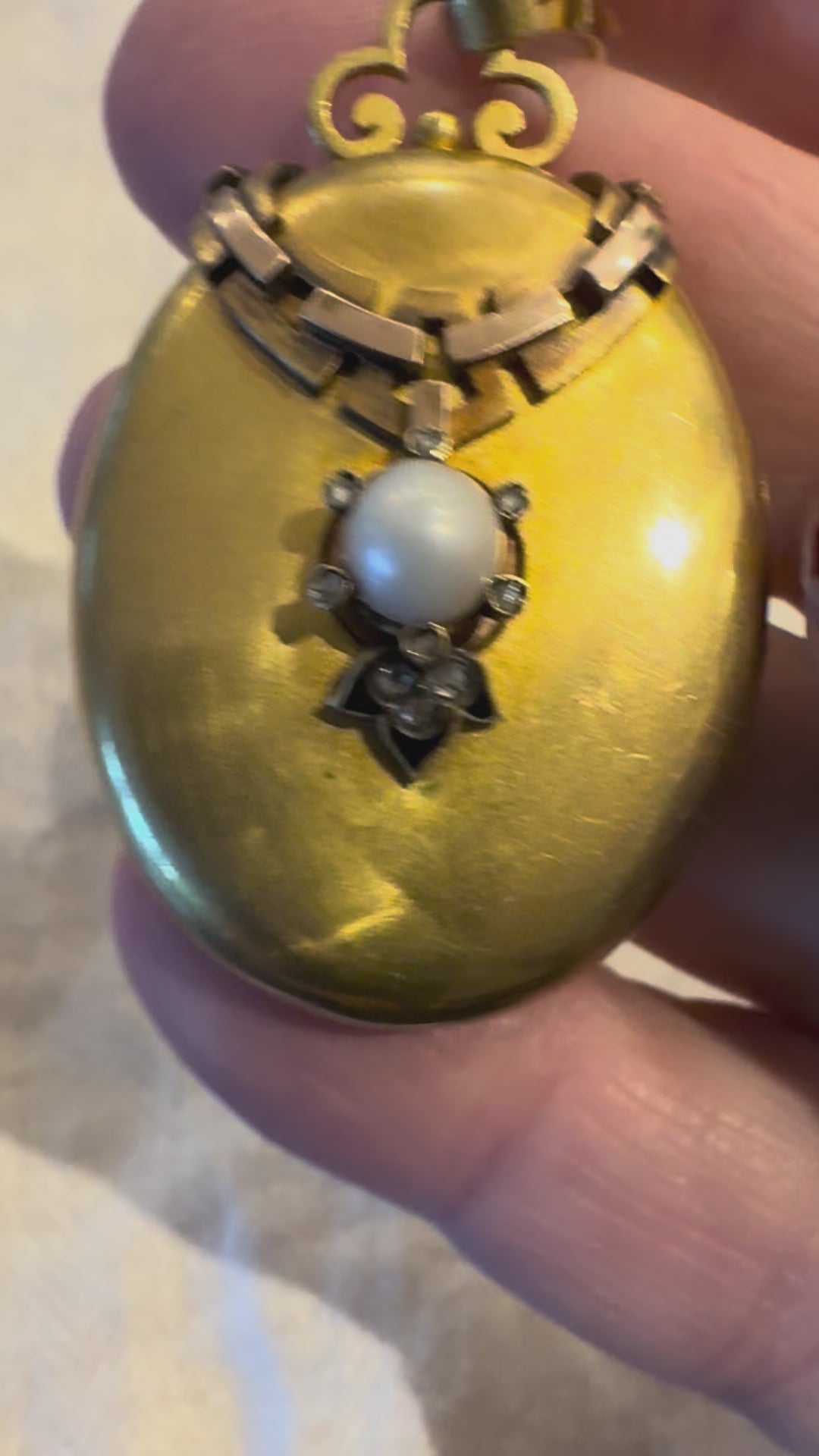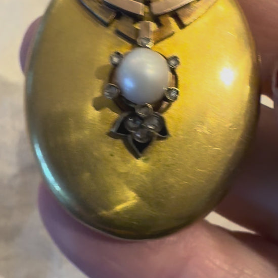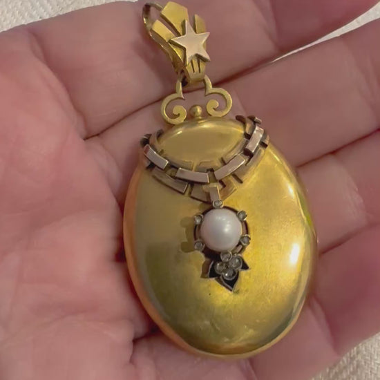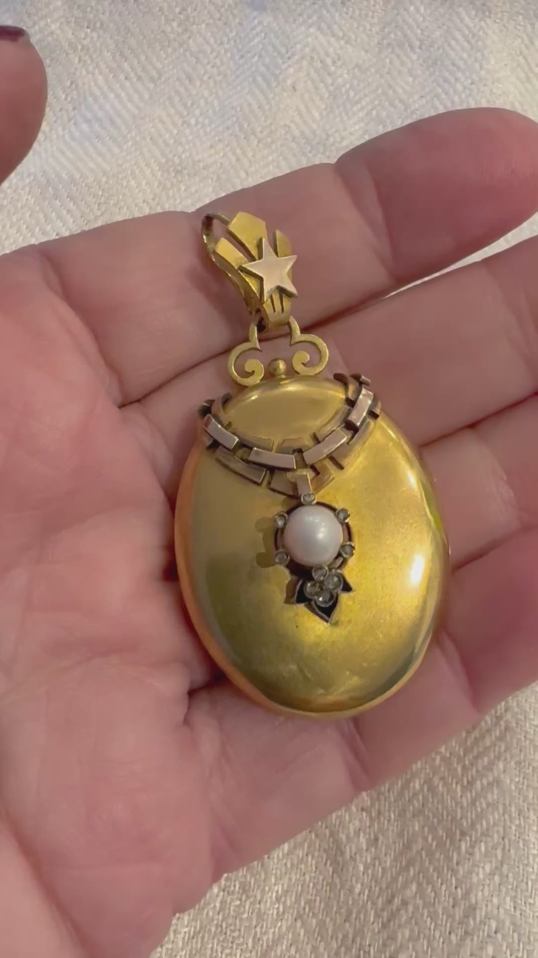 Charming 14 karat gold locket with a chain motif on the front and a fantastic star on the bale. The body of the locket, and the embellishments are two different colors of gold.The front also has a pearl and rose, cut diamonds and a tiny enamel leaf element. It has the frames on both sides inside the locket and the original glass on one side. The locket weighs 17.83 g and measures 2 1/2 inches tall, including the bale by one and a quarter inches wide