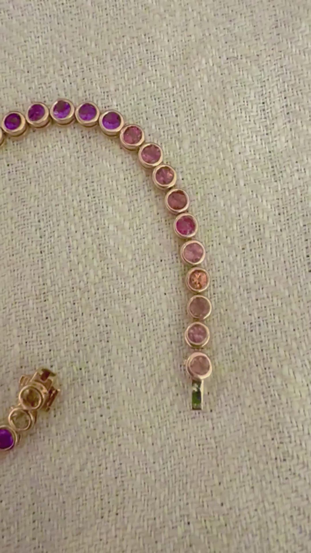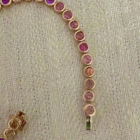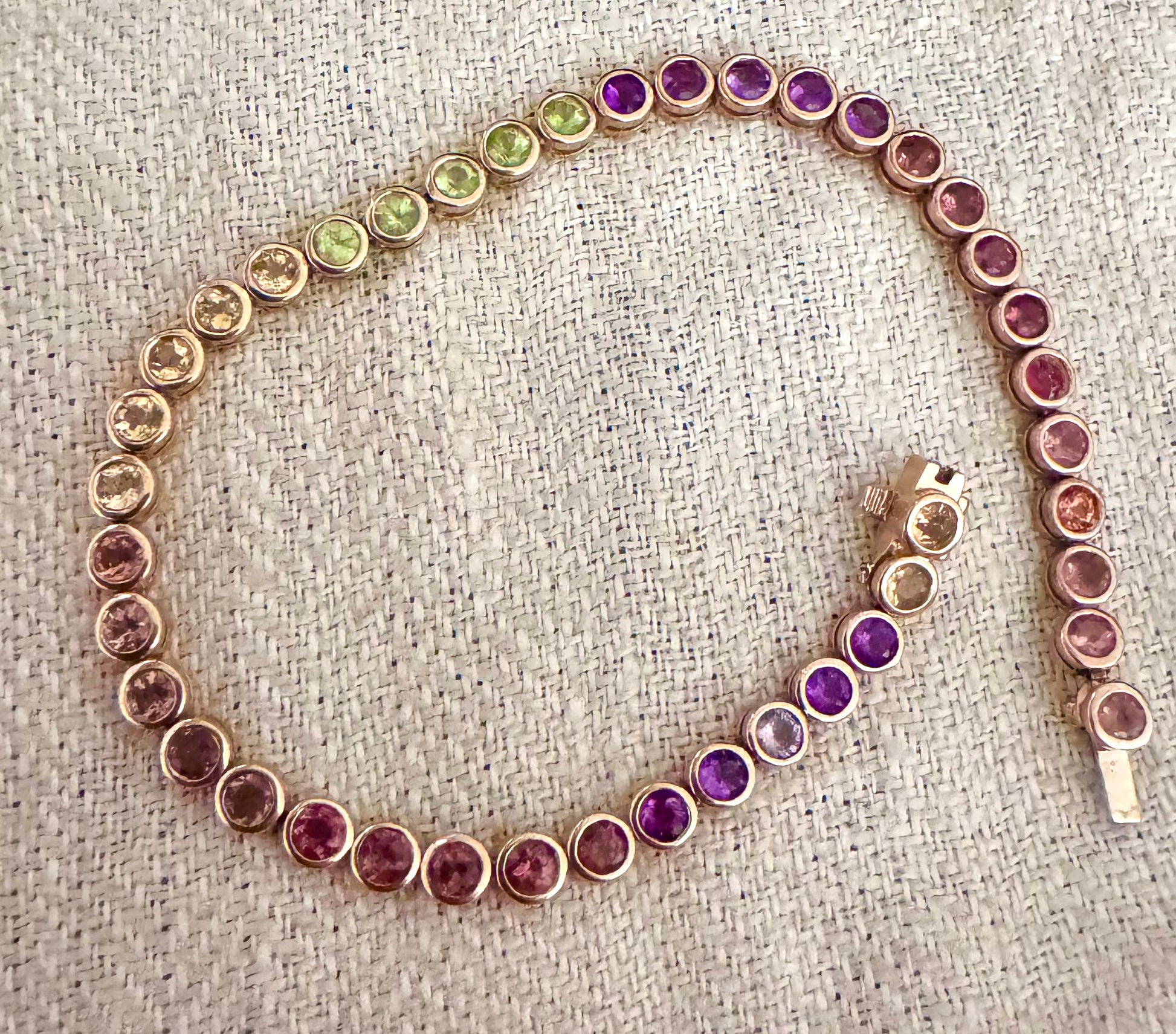 Lovely multi stone rainbow bracelet with tourmalines, amethyst, citrine and peridot, each stone bezel set in 14k yellow gold. The bracelet measures 6-3/4” long with a bayonet clasp and a hidden safety catch and weighs 7.53 grams.