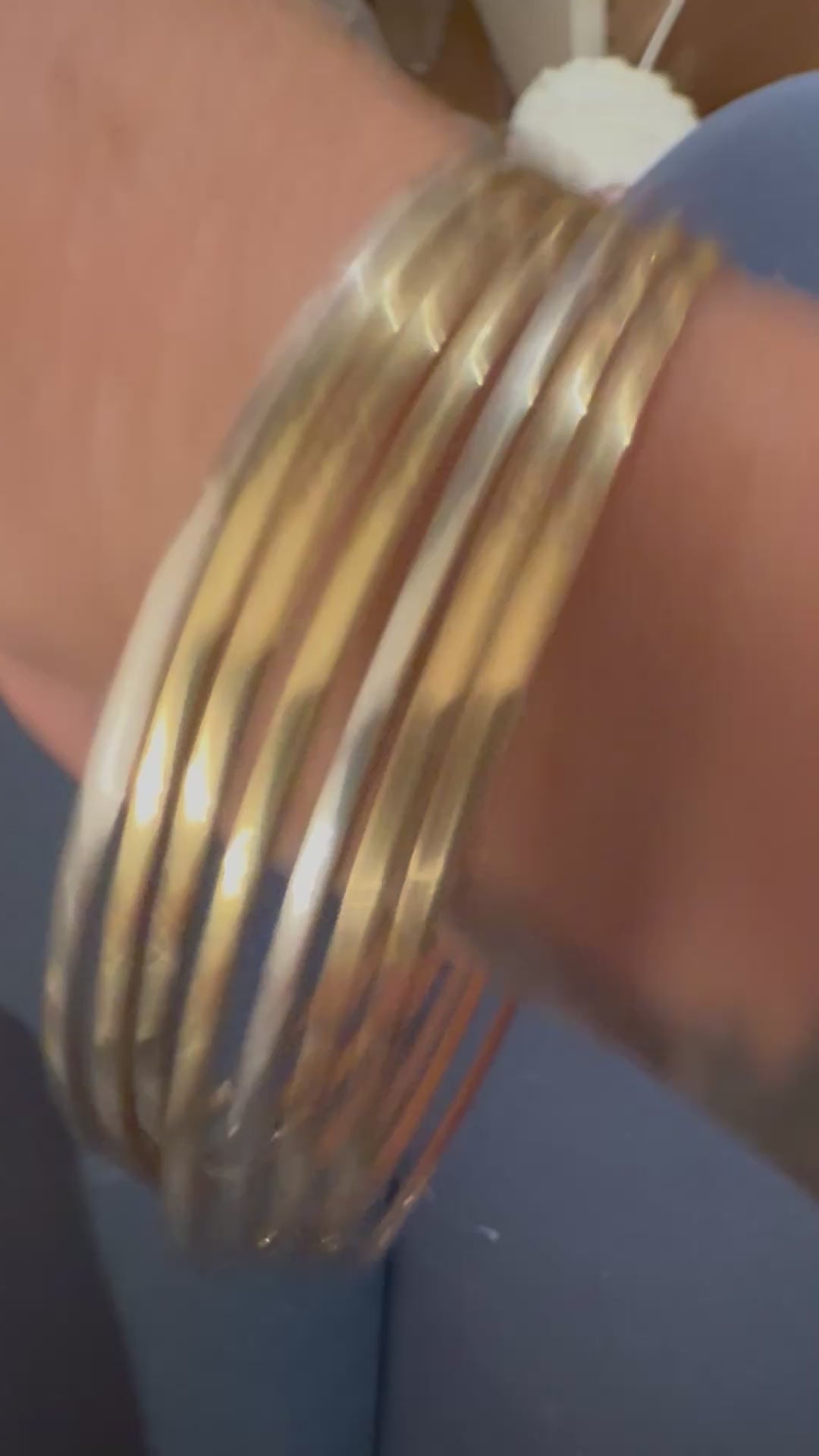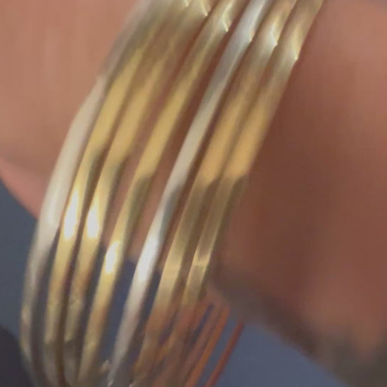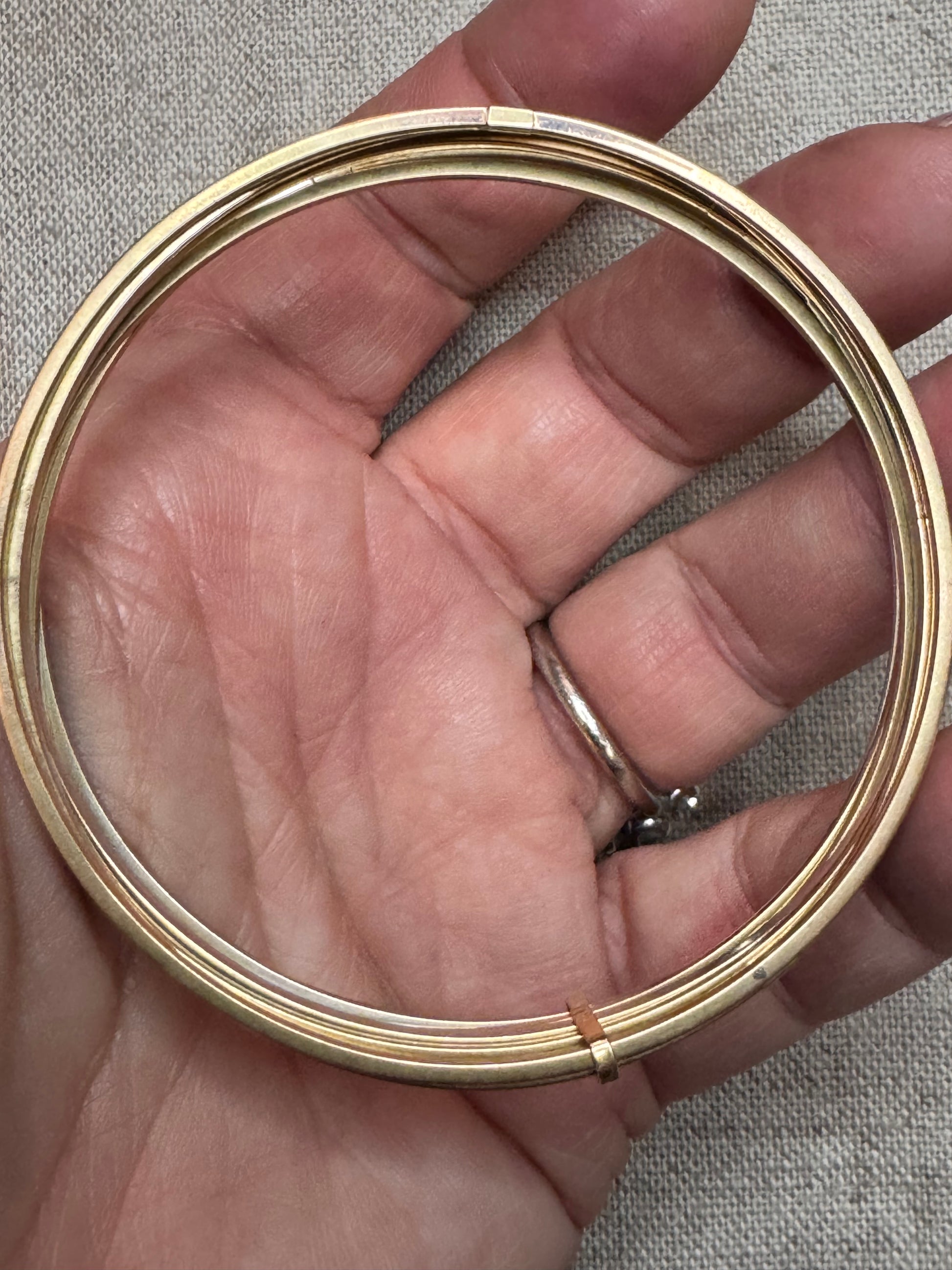 A wonderful semainier, a set of seven bracelets representing the days of the week. Five of the bracelets are yellow gold and two are white gold representing the weekend. They are currently held together with a small clip which can be removed so they move more freely and can be worn with other bangles. they weigh 11.09 grams and measure 2 5/8 inches in diameter so they will accommodate a larger hand. in great condition and at an affordable price. marked 14 K Italy