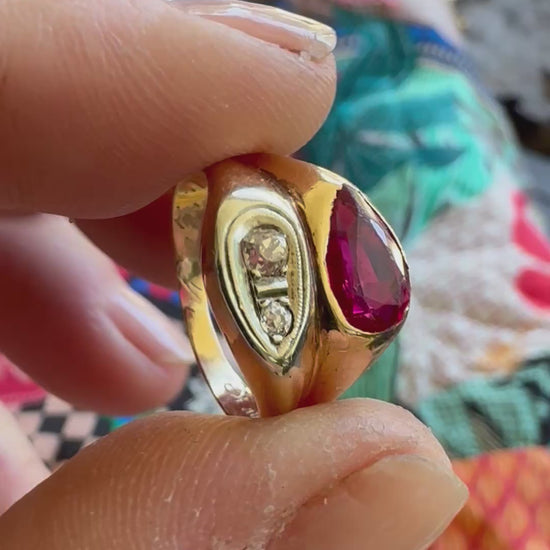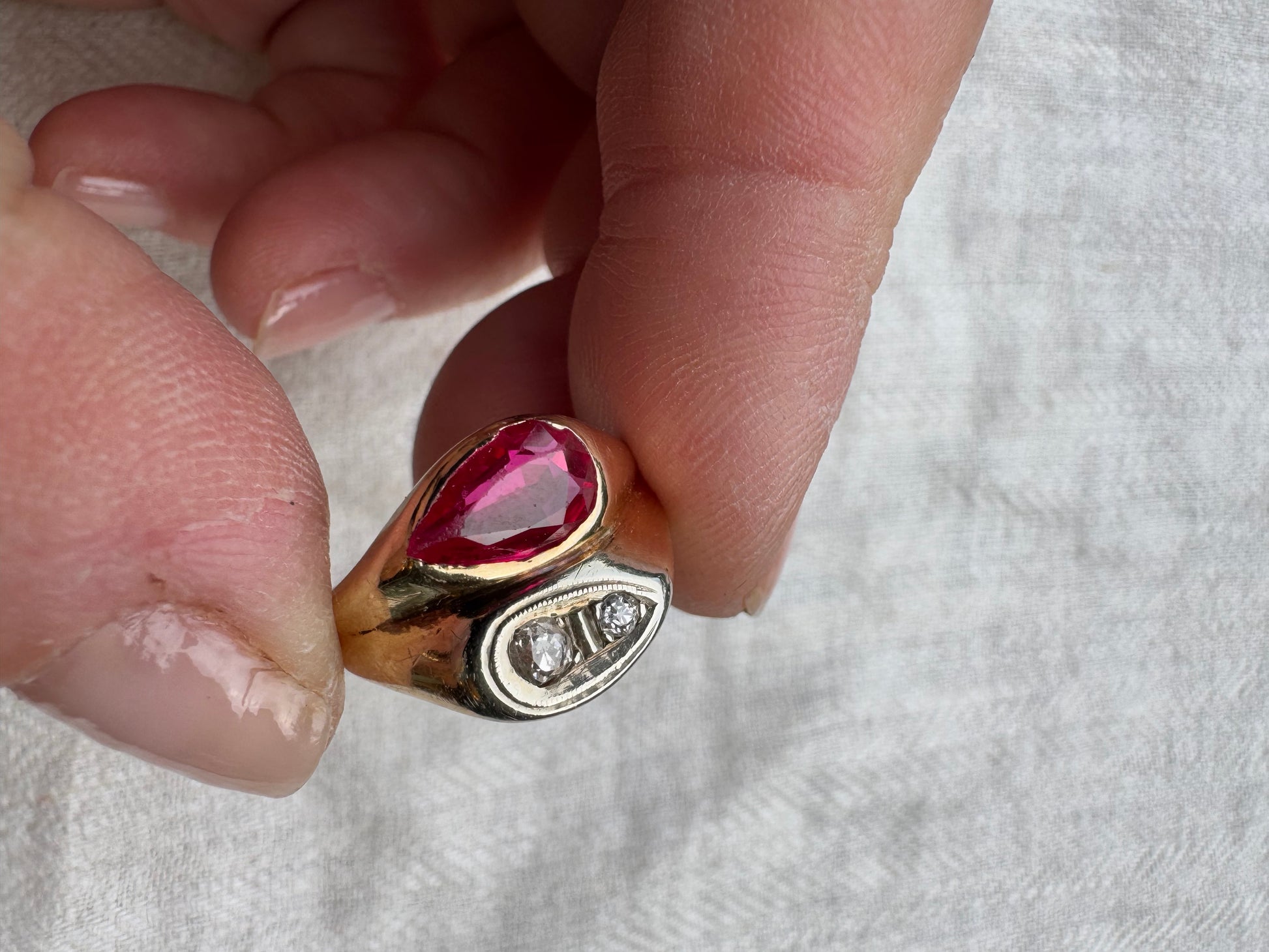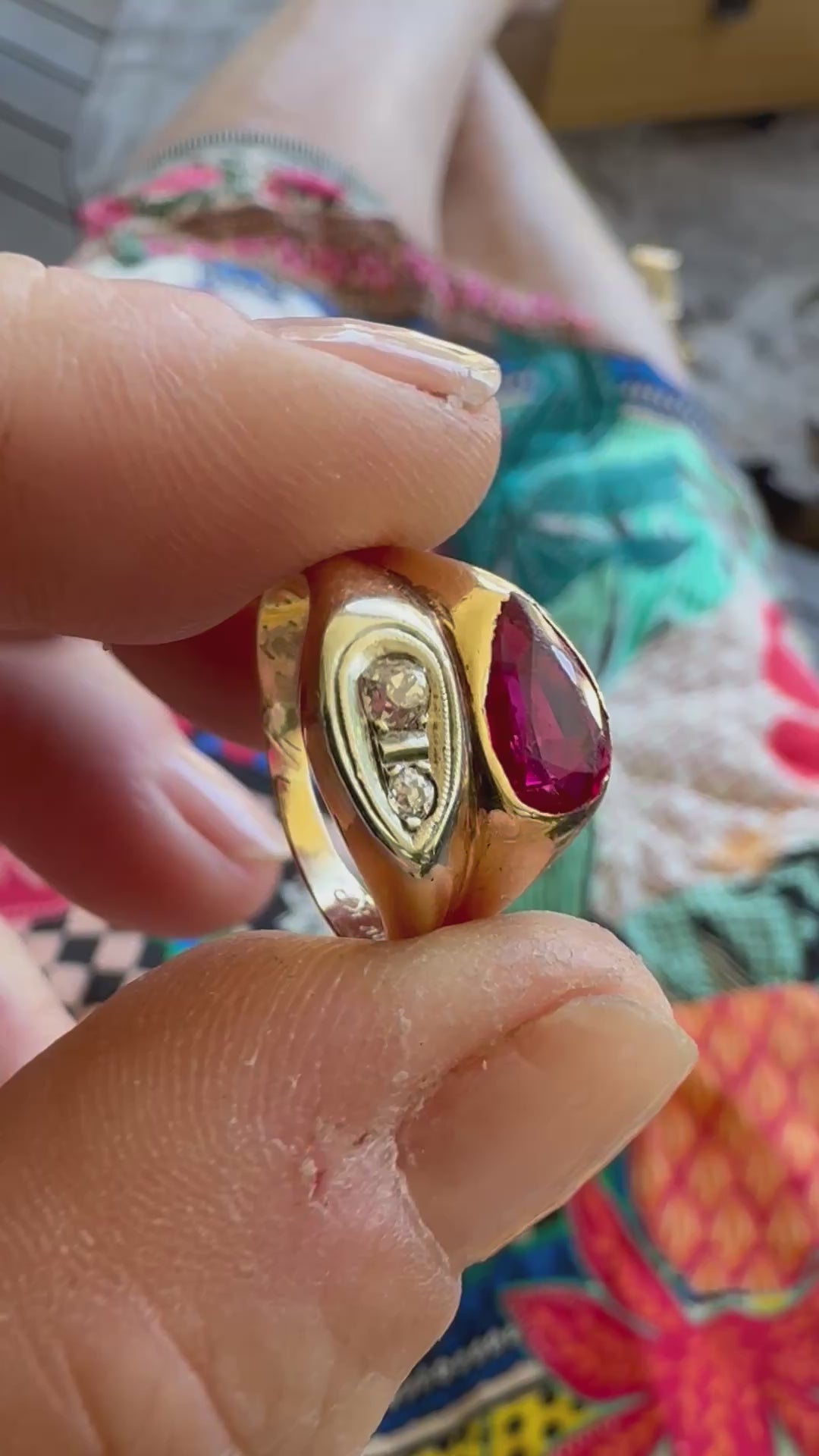 Almost identical to thing ring worn by Tony Soprano, this beauty is actually probably older! It’s hand engraved with an inscription on the inside and stamped 14K, and deatures a synthetic pear shaped ruby and two chunky mine cut diamonds. Currently size 7 it can be sized up or down.
