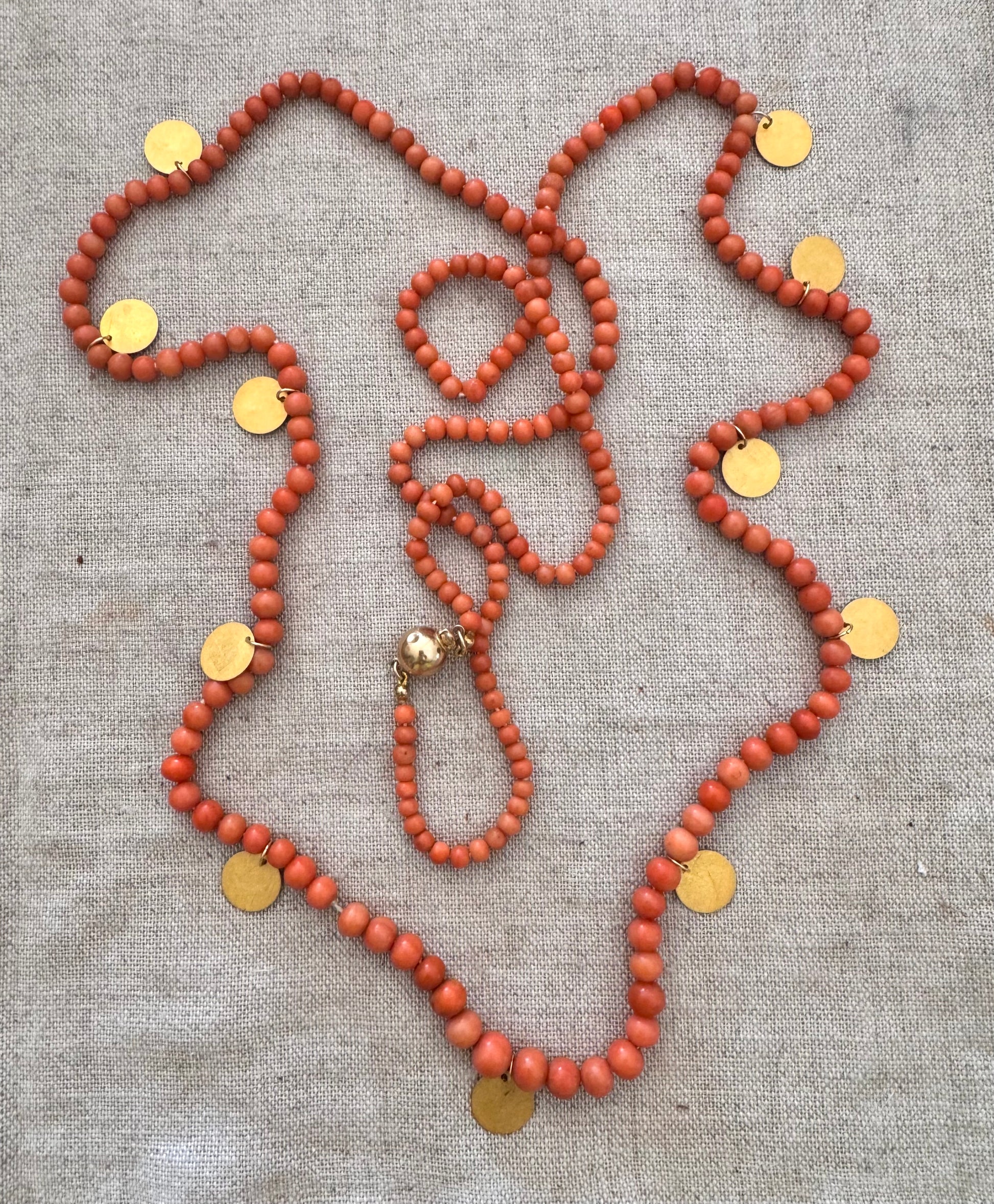 Fabulous antique coral beans with over 9 grams of 14 karat gold disk accents and 14 karat gold clasp. Beads are graduated from 5mm up to 8 mm and the entire necklace measures 82 inches. It can be wrapped multiple times around the neck or wrist.