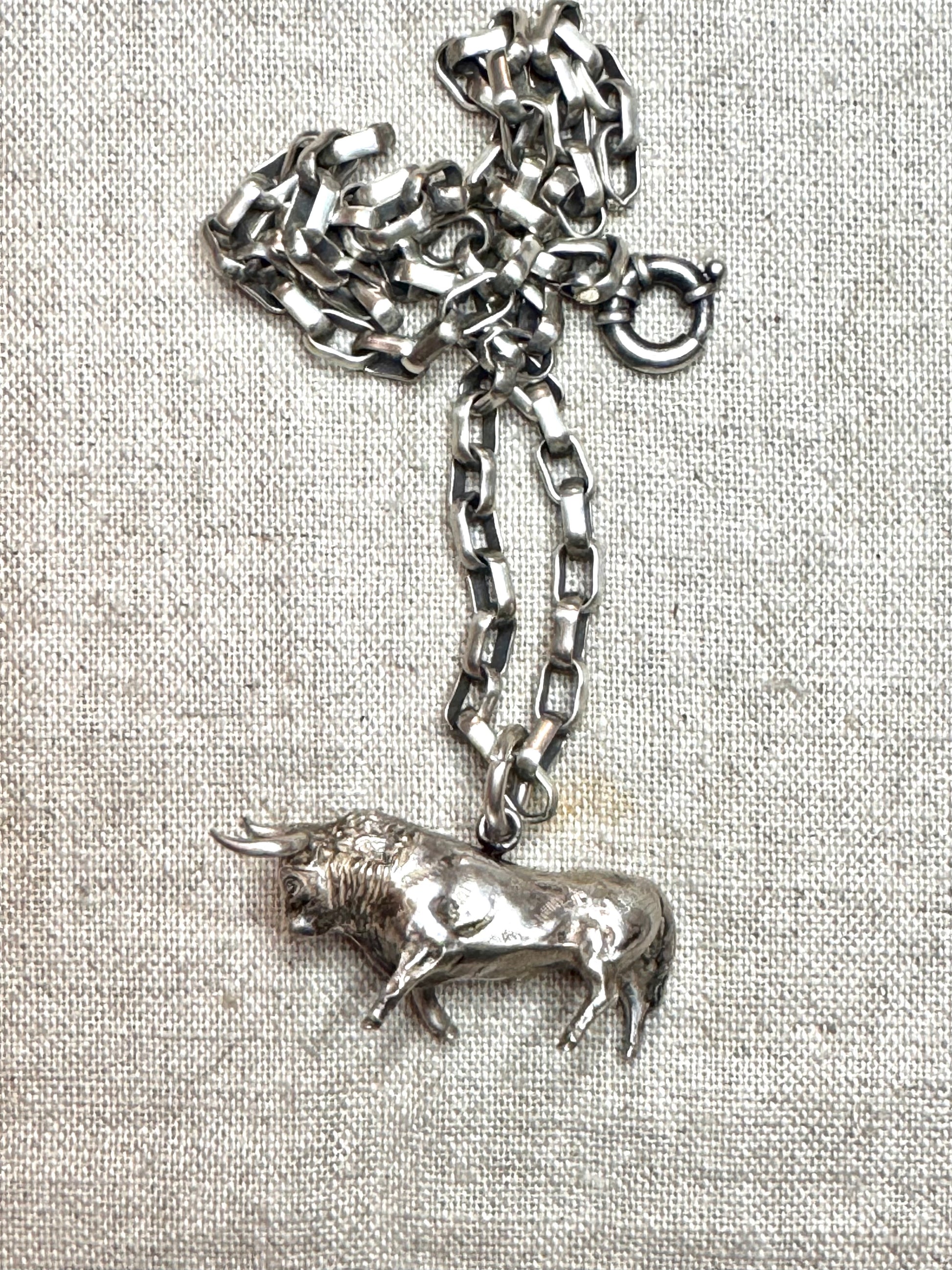 Incredibly realistic with amazing detail, this heavy vintage sterling silver bull pendant weighs a chunky 22.55 grams - he is 2” long from the tip of his horns to his tail. He has a large bail that will accommodate a heavy chain like the one he is shown on in the images - sold in a separate listing.