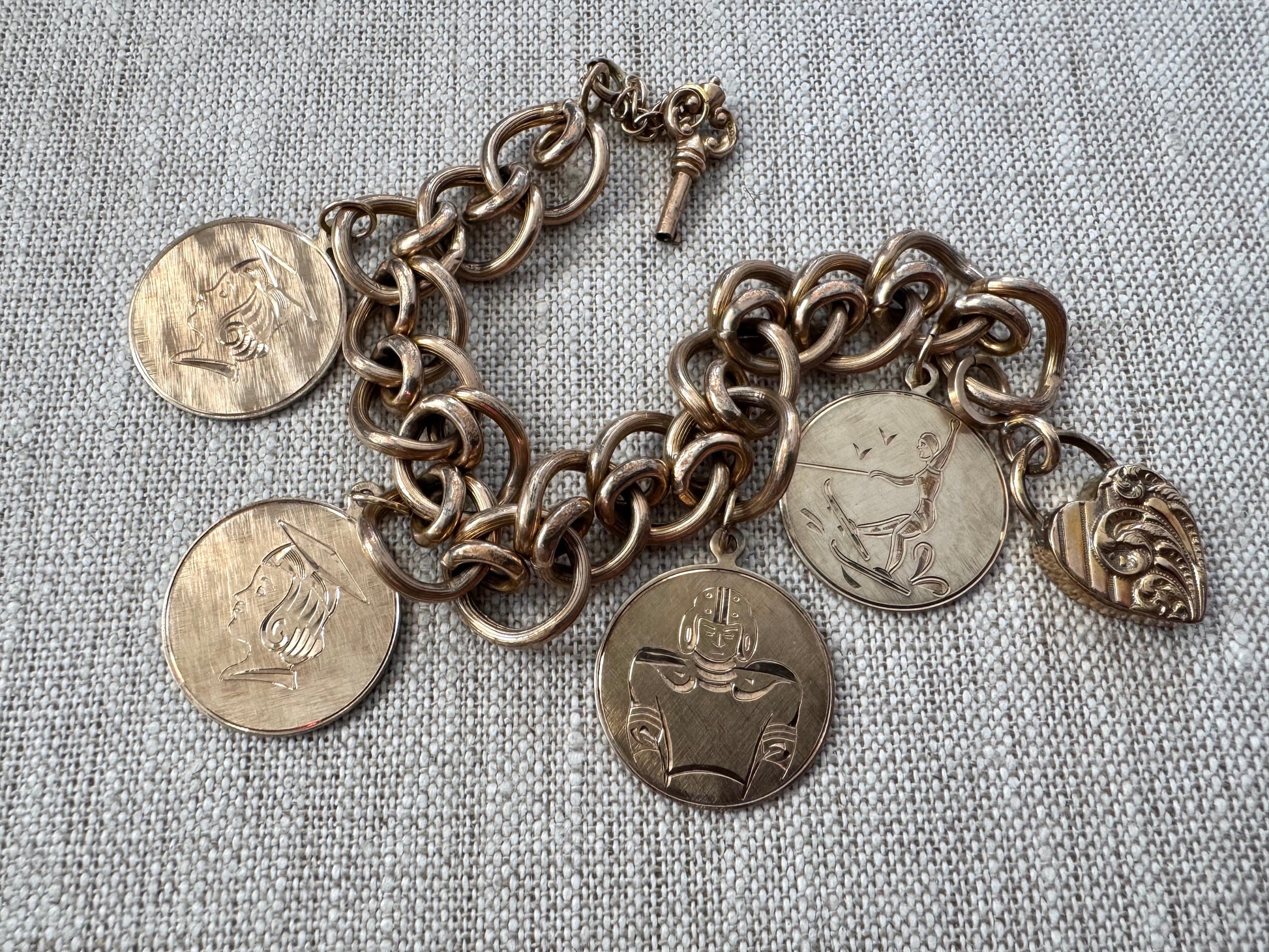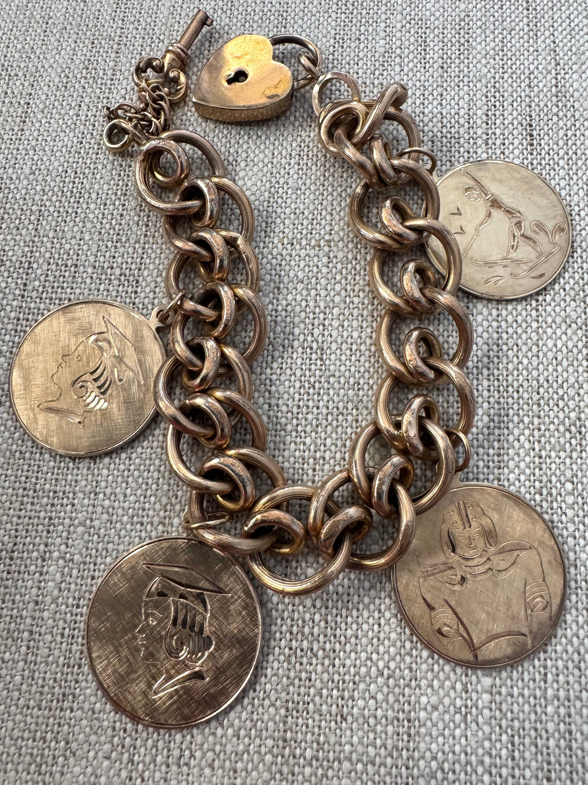 this incredible mouse trap style charm bracelet has four hand engraved disc charms, two depicting a girl in a mortar board (graduation hat), one depicting a football player and one depicting a girl water skiing. The wonderful bracelet closes with a locking heart charm. The key is attached to the bracelet on a chain and can be removed or worn as a charm. the bracelet measures 7.5” and weighs 29.95 g