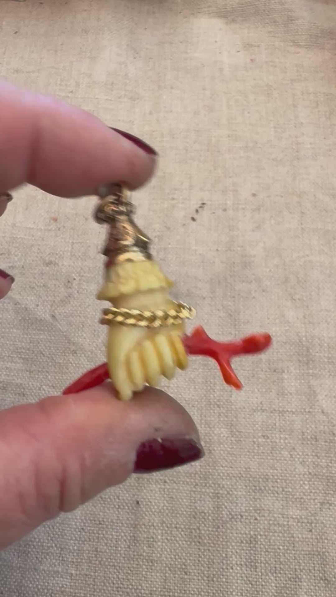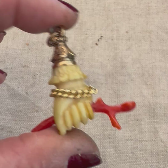 Antique hand carved bone hand with a coral staff and 14k gold decorative top and curb chain bracelet. Measures 1-1/2” tall including ring