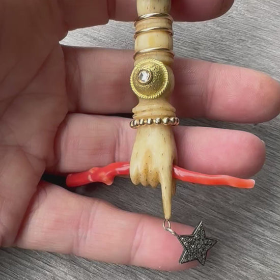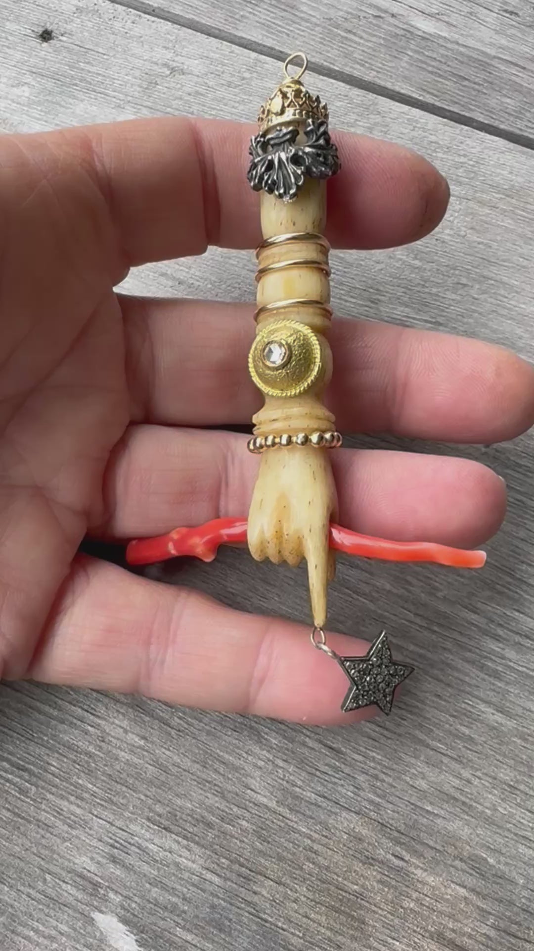 An antique hand carved bone hand with a coral staff and various embellishments consisting of 14k gold, 18k gold, oxidized silver, and diamonds. The hand measures 4 1/4” long including the bale and the star, by 2 1/4” for the coral staff. A truly unique piece made by me using antique and new elements. Coral beads sold separately.