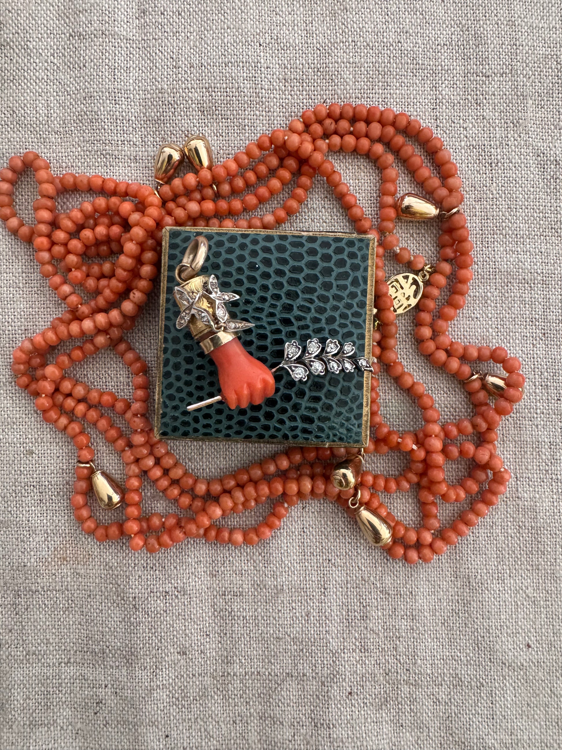 Assembled from antique parts this lovely coral hand, clutching a diamond frond, wearing a gold bangle and diamond encrusted 14k gold cuff with diamond dangle, measures 1 3/4” including the bale. The diamonds, clean and very sparkly, are about 40 pts total carat weight. The 14k gold accented coral beads are available separately