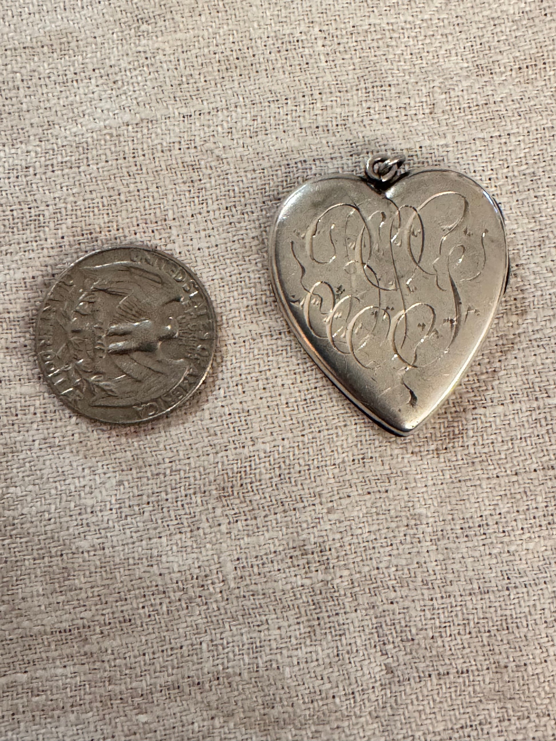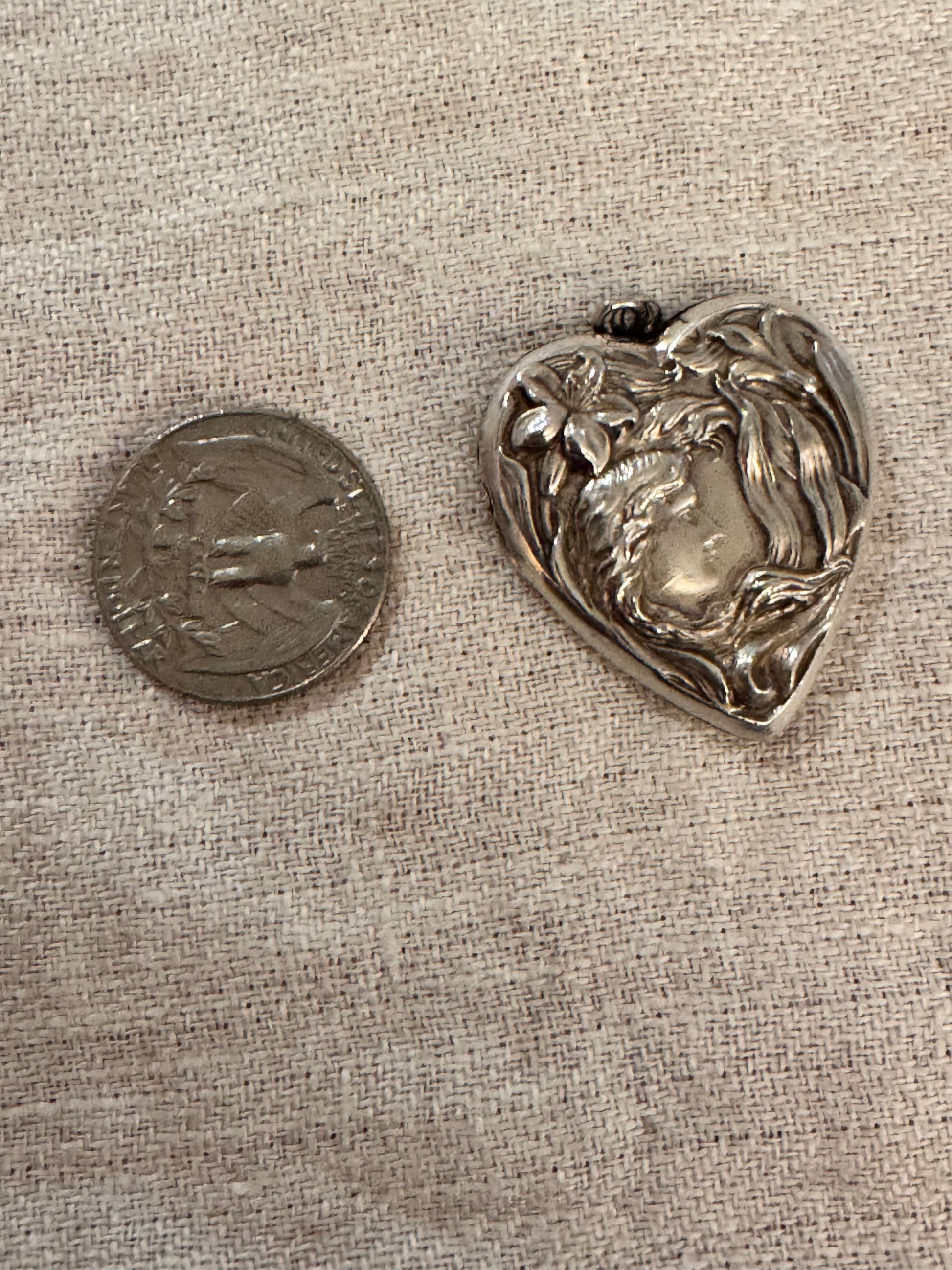 Sterling silver, Art Nouveau locket with a beautiful raised image of a woman on one side and an exquisite hand engraved monogram on the other the monogram is BLG or some combination of those letters. The locket measures 42 mm tall, including jumping by 32 mm wide. The locket has both frames for holding pictures in place but no glass. It is hallmarked Sterling. weighs 10.73 grams