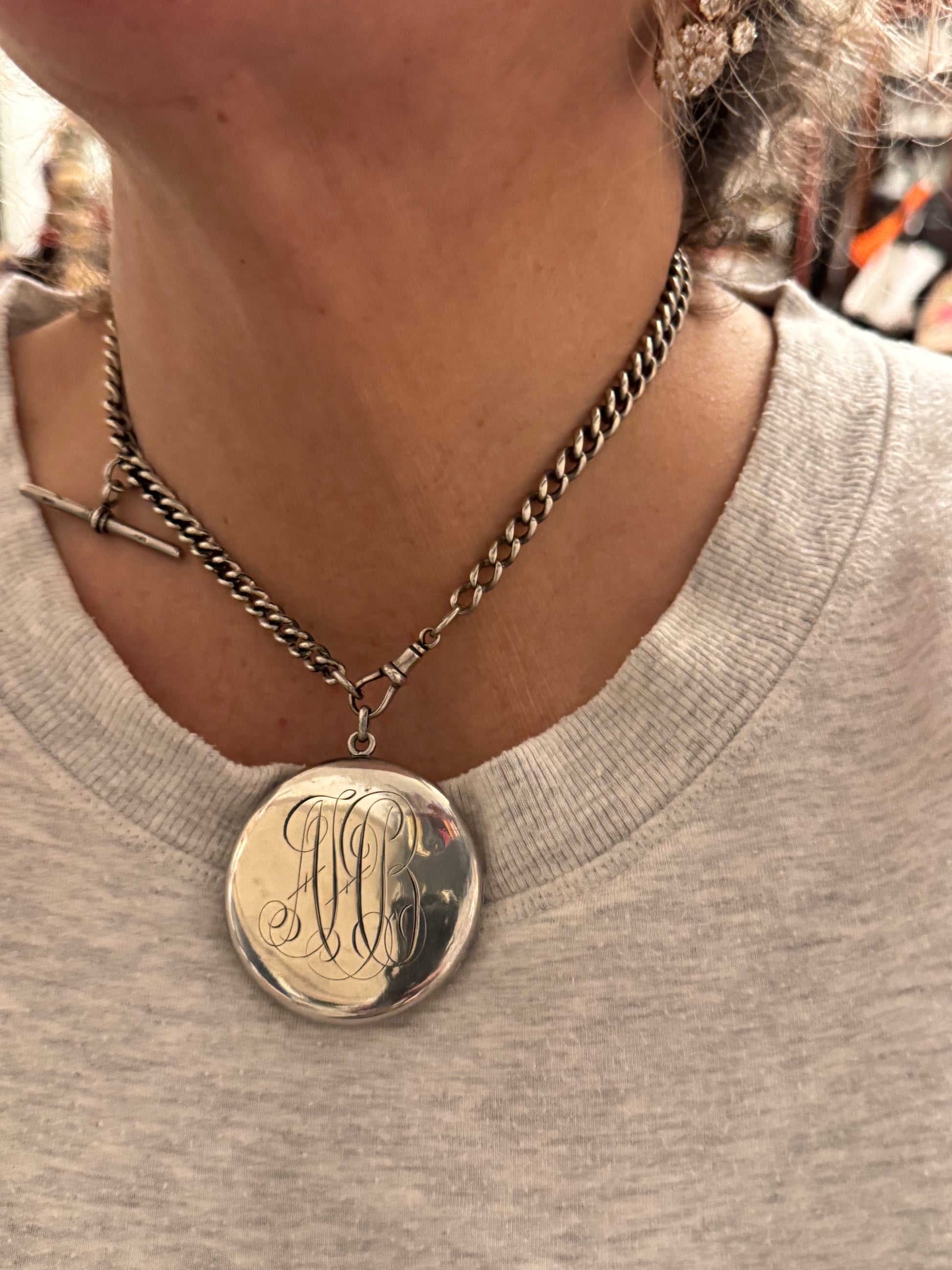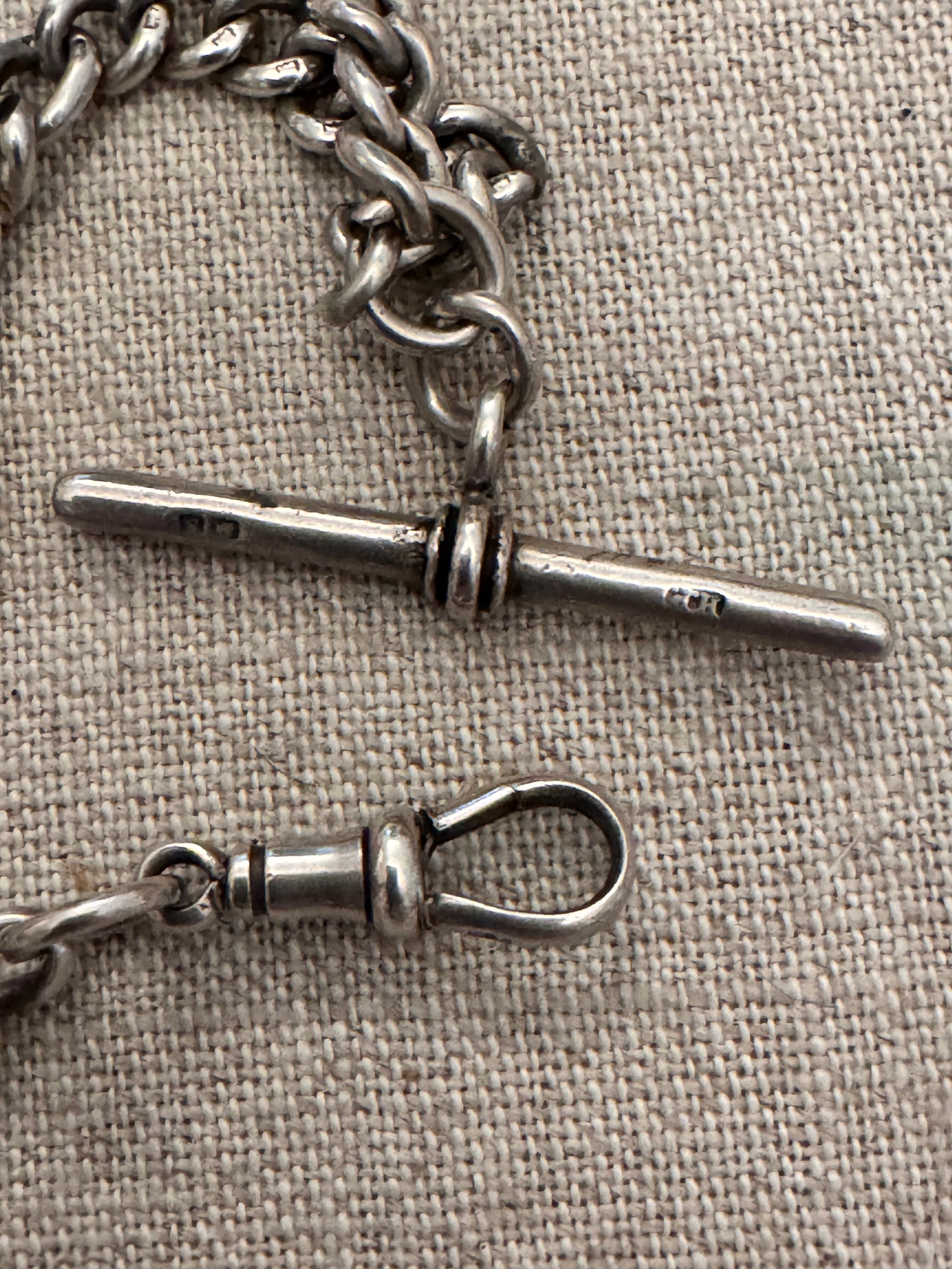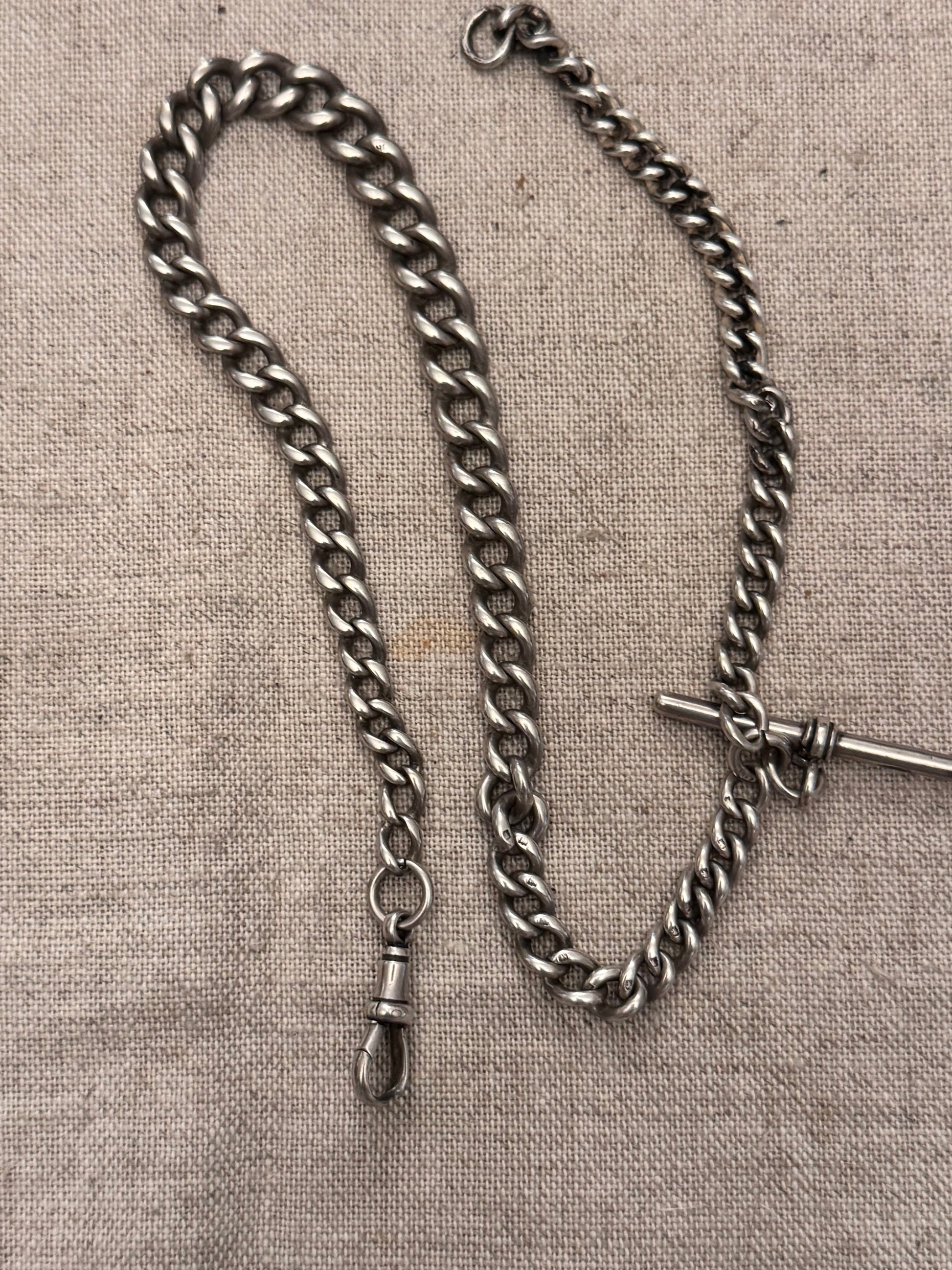 Beautiful and simple sterling silver antique English watch chain. The chain measures 18 inches and weighs 54.69 grams. Each of the main links is stamped and it has a good size dog clip, and T bar.