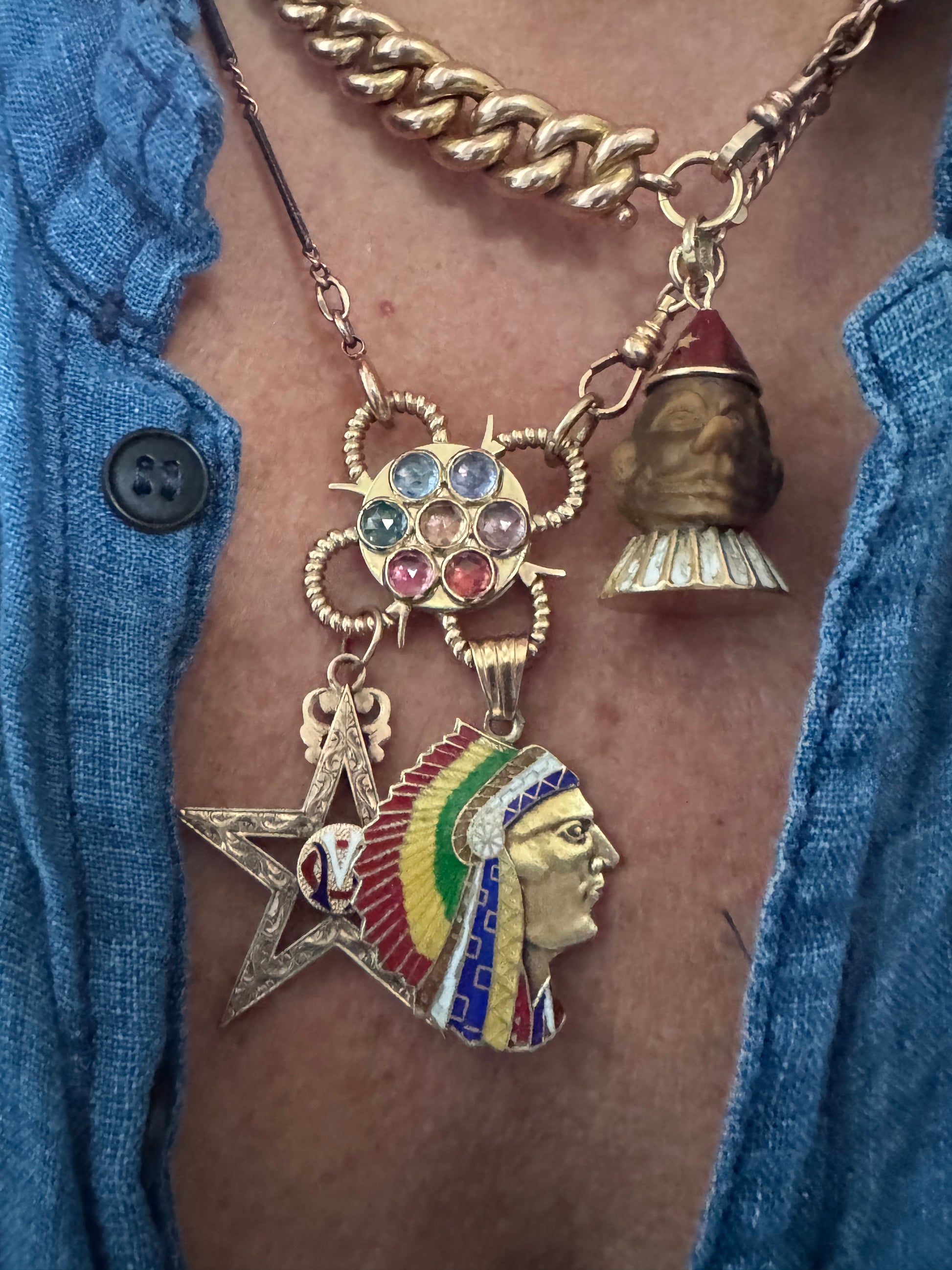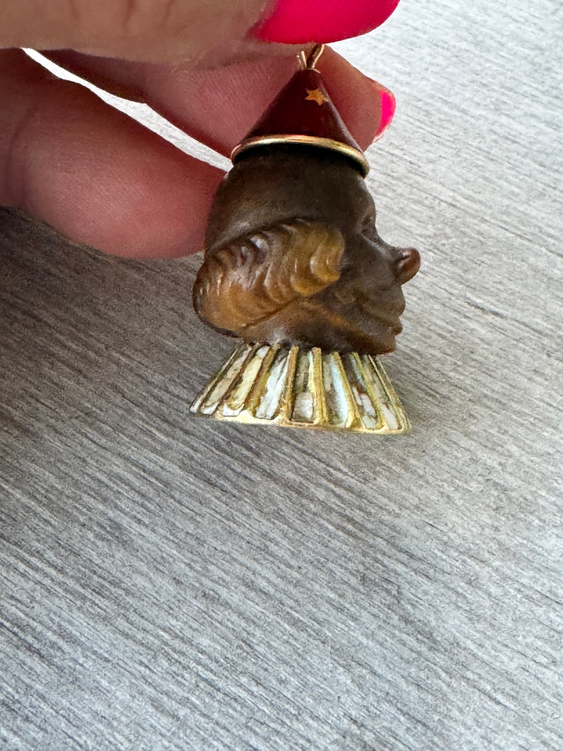 A spectacularly cool and creepy carved tiger eye clown with 18k gold and enamel ruff and hat. He measures 1-11/16” including bale and weighs 16.45 grams
