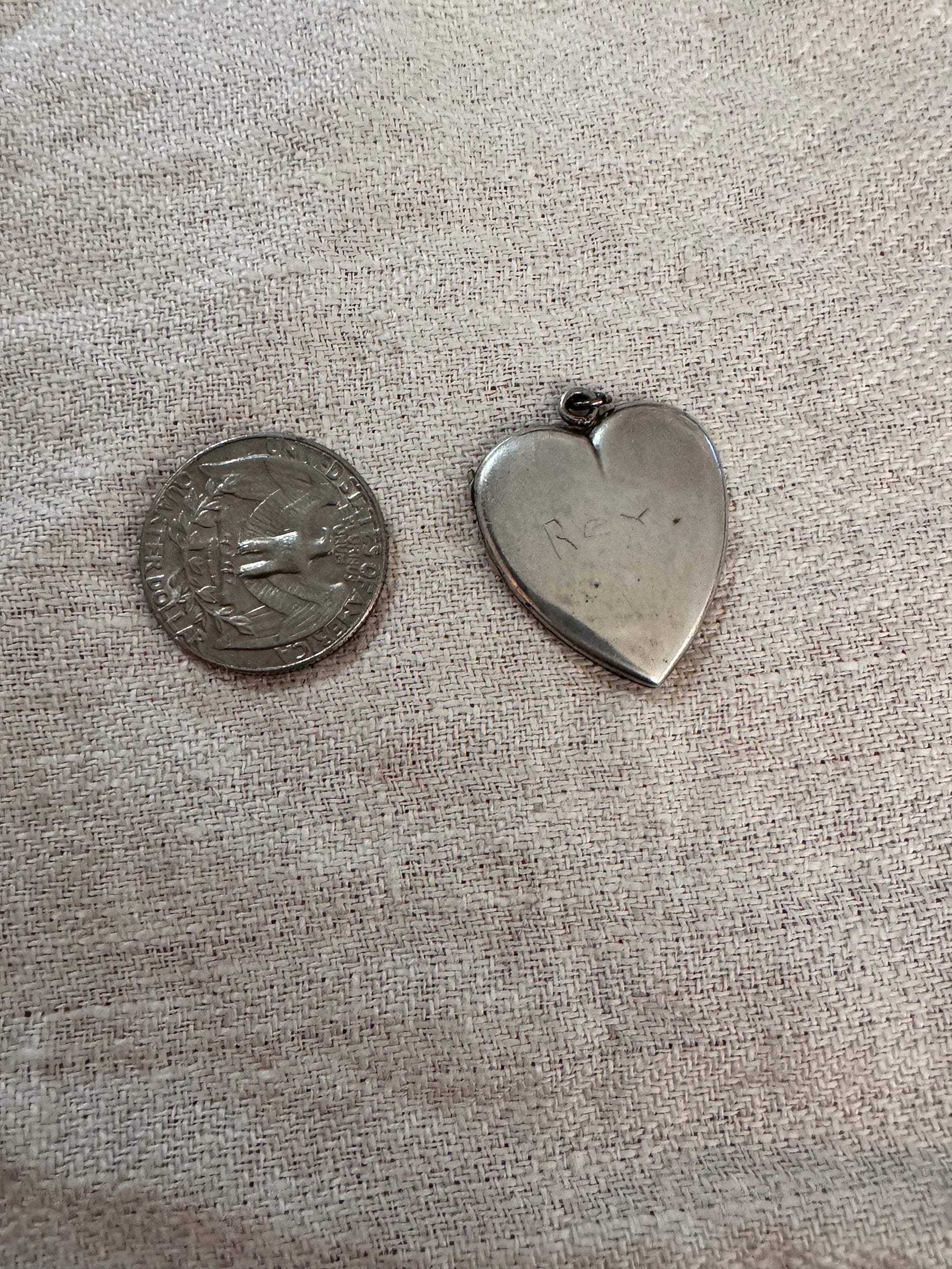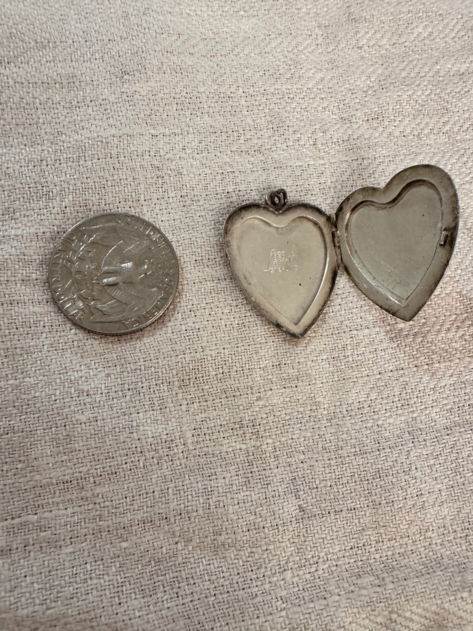 Lovely sterling silver locket with hand engraved scroll pattern on the front and clean on the back. The locket measures 32 mm including bail by 29 mm wide. It weighs 6.78 g and is marked SAART Sterling on the inside. It has two deep wells for pictures.
