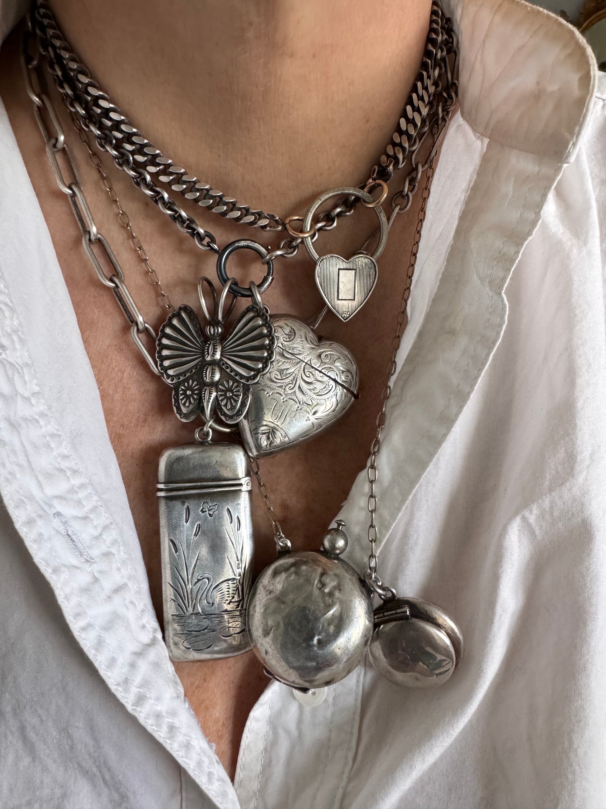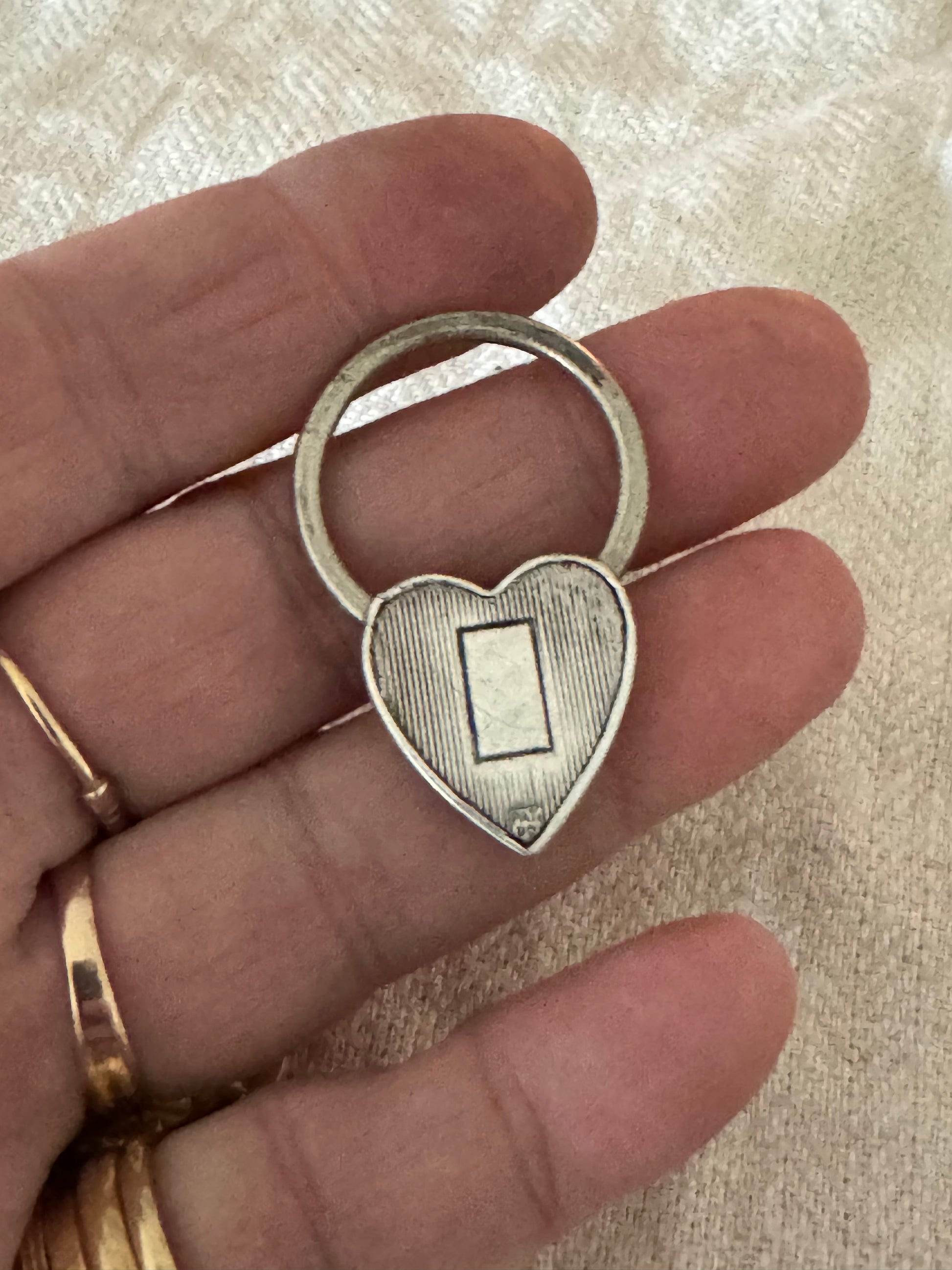 clever and chic heart shaped padlock. The padlock mechanism works by pulling down the small tab on the back of the heart while at the same time swiveling the circle on the top. It opens to reveal a space where you can add the chain. The lock measures 1 1/2 inches tall by 1 inch wide. shown with a chain that is sold separately, but it will work with any chain that has larger findings on the ends