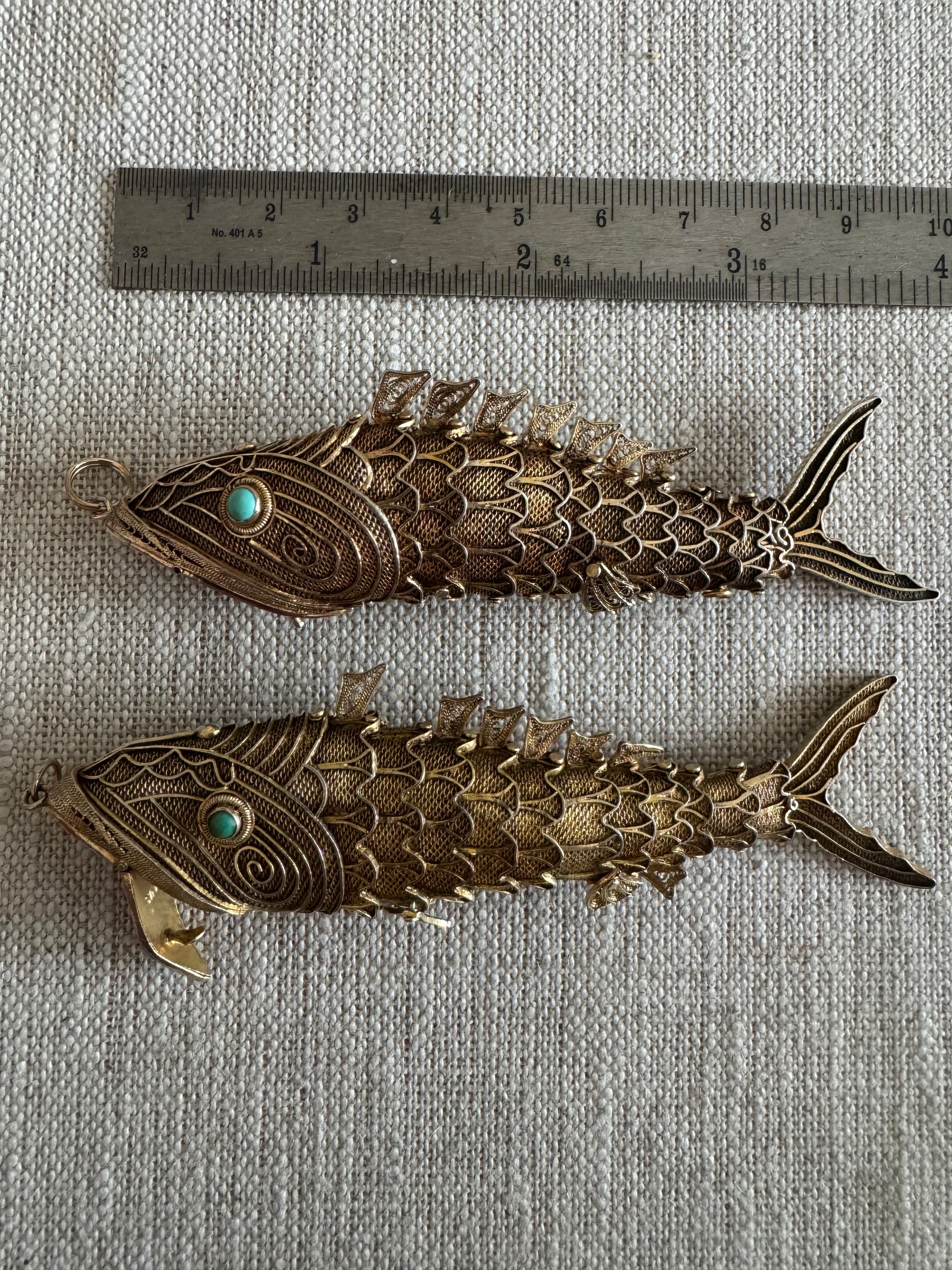 Large fully articulated antique Chinese silver fish with gold plating and turquoise eyes. they measure 4 inches including the ring at the top, weigh 20.91 grams each and have opening mouths. They are marked silver inside the mouth. I have 2 of these, the price is for one fish.