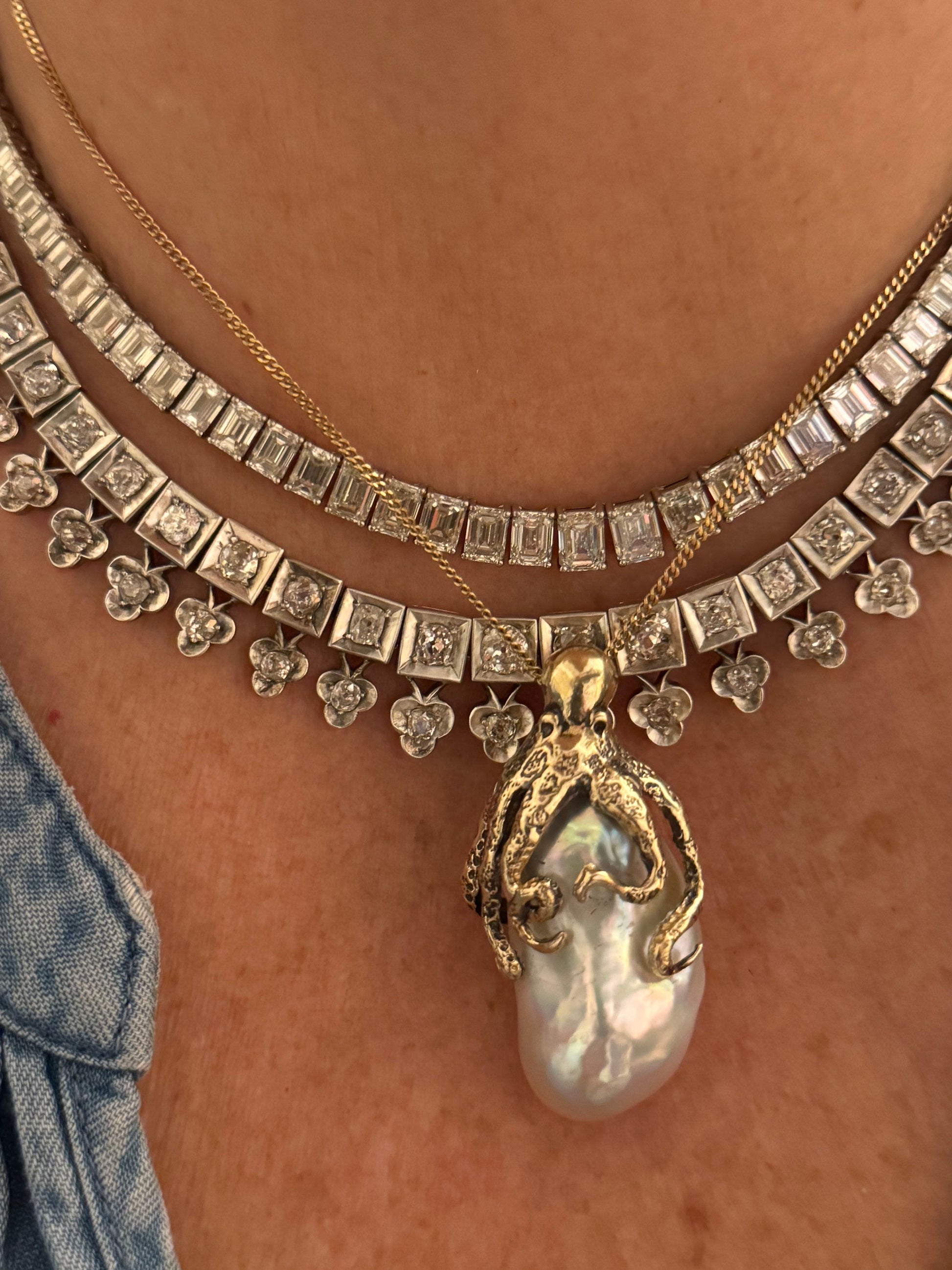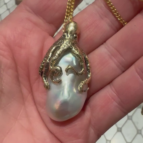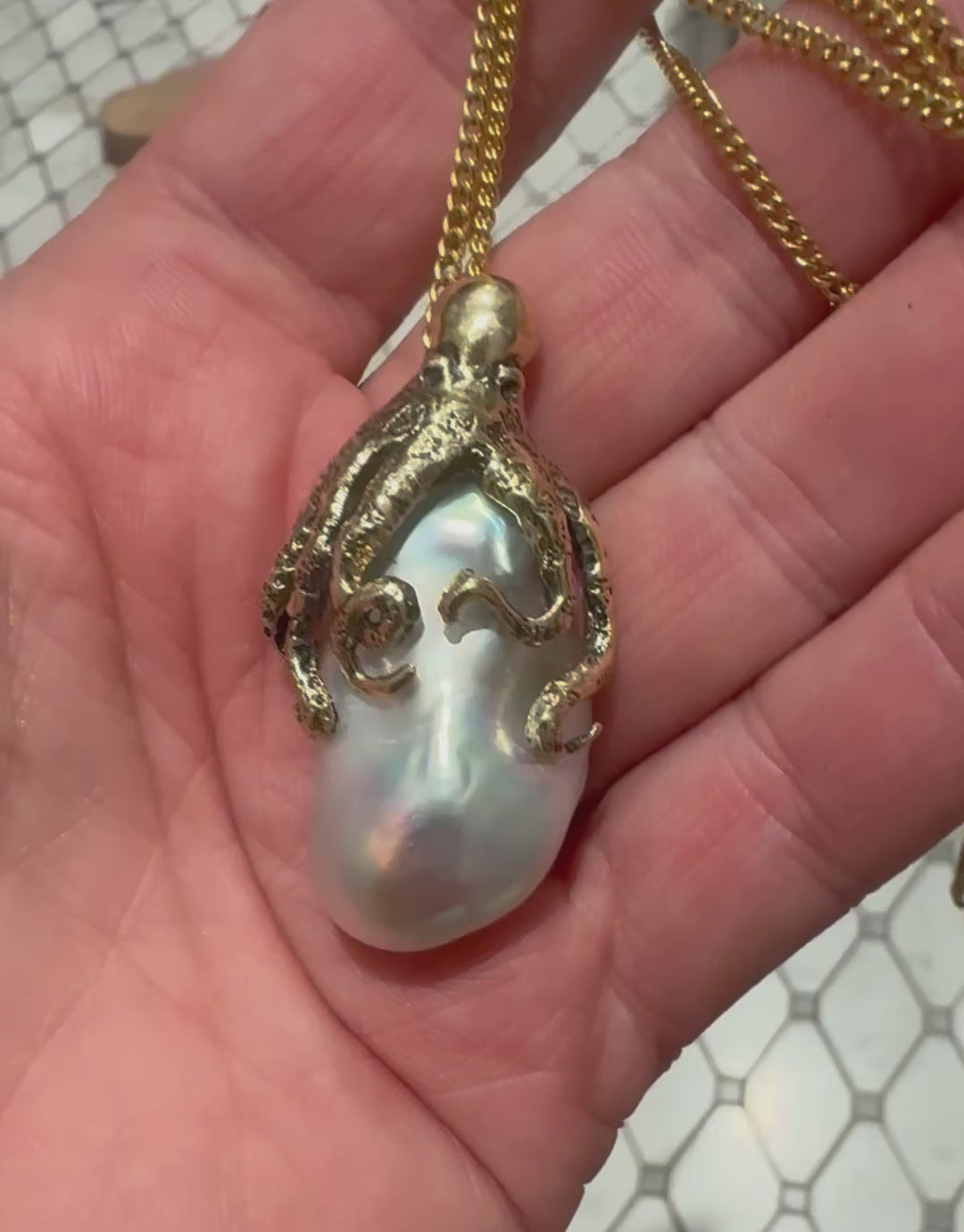 Originally made for my line at Bergdorf Gooman I designed and made this octopus to hold all kinds of things. This version is guarding an enormous freshwater pearl. The 10k octopus without the pearl weighs 15.53 grams and the total length of the pendant is 50mm. I sometimes added rubies or diamonds to his eyes…if you buy this piece I can add your choice of stones for an additional charge - just email me. This listing is for the pendant only. He does not come with the chain.