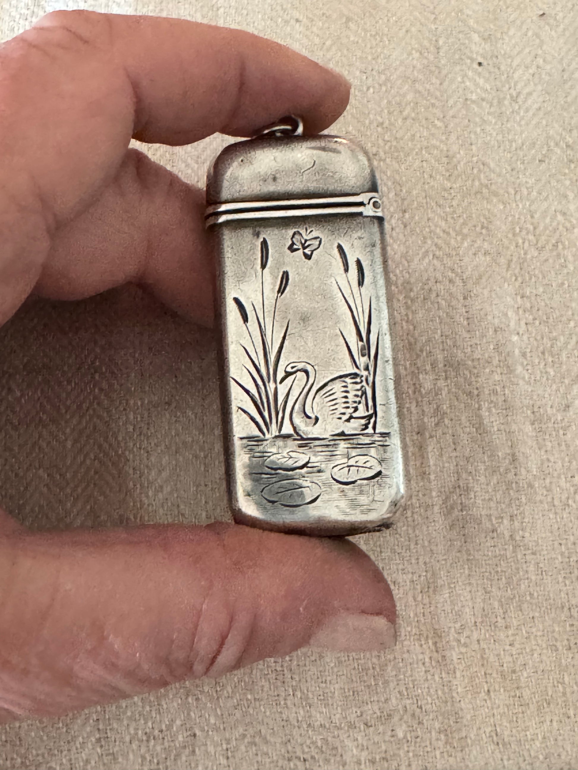 Beautiful sterling silver, long and slender match safe, this piece probably belonged to a woman and was hung from a chatelaine. The front is engraved with a swan on a lily pond with a butterfly and cattails, the back has a foliage design. It has a nice strong hinge and chunky jumping. This piece measures 2 3/4 inches including the jump ring by 1 inch wide.