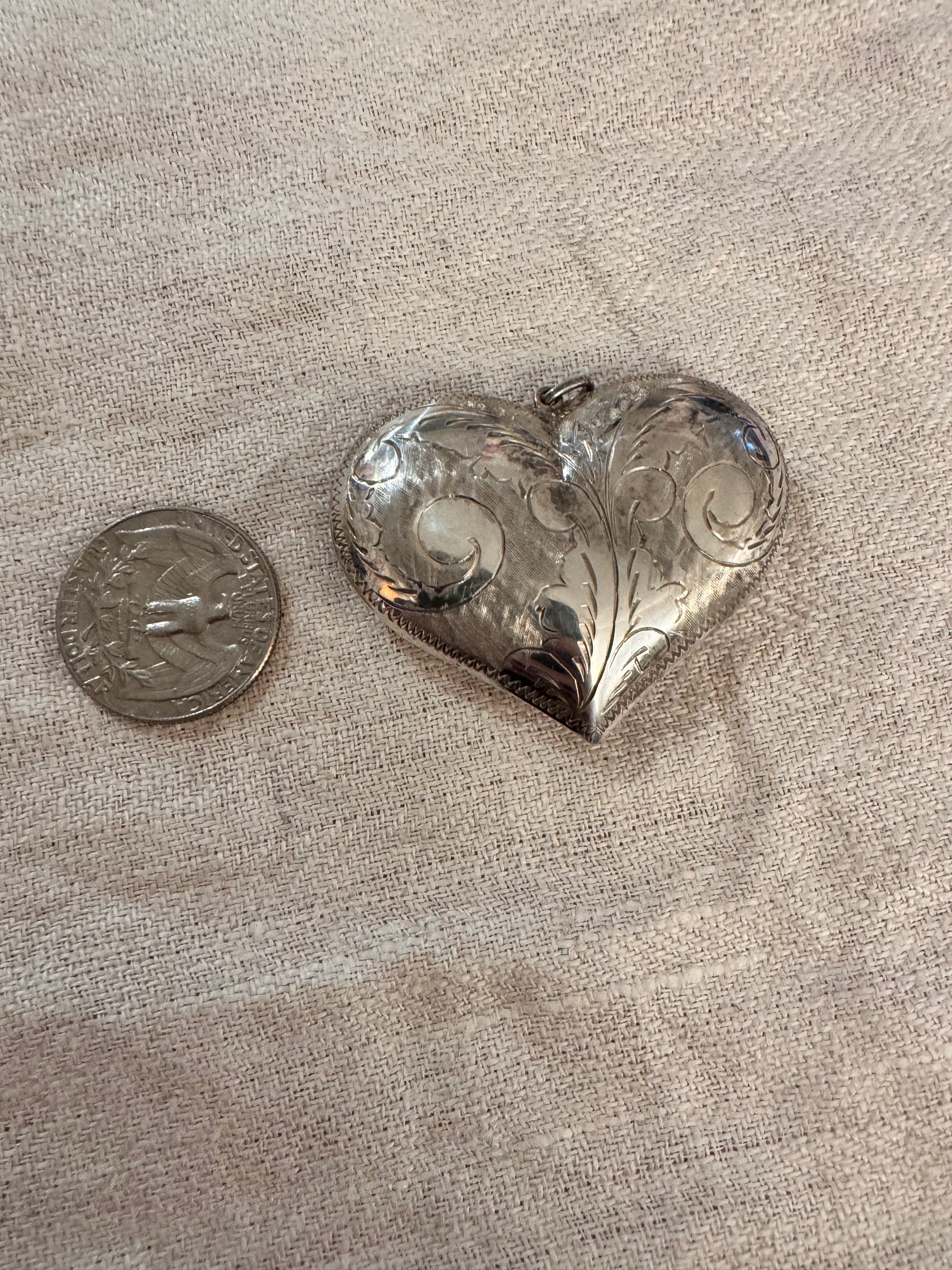 Beautifully shaped and engraved sterling silver puffy heart pendant. The pendant measures 45 mm including bale by 49 mm wide. Marked for sterling silver on the bale. The pendant weighs 11.27 grams