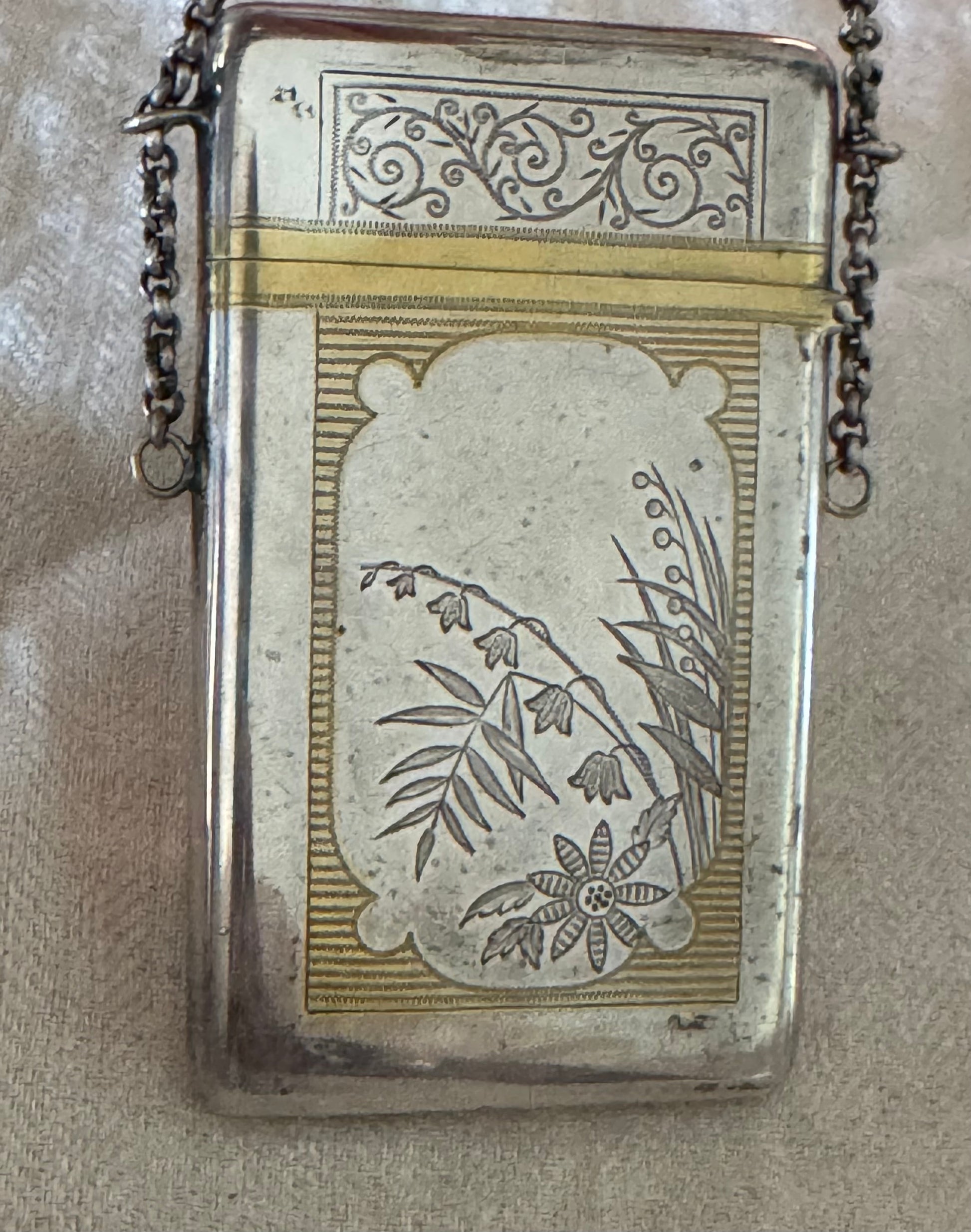 A magnificent antique calling card box from a Newport, Rhode Island estate. Engraved with floral patterns on the front and back and enhanced with gold overlay. The box measures 3 3/4“ x 2 1/4“ and has a sturdy chain so it can be carried like a purse. it fits modern business cards and would be a fantastic purse accessory. The box contains a note from the original owner identifying the gift giver.