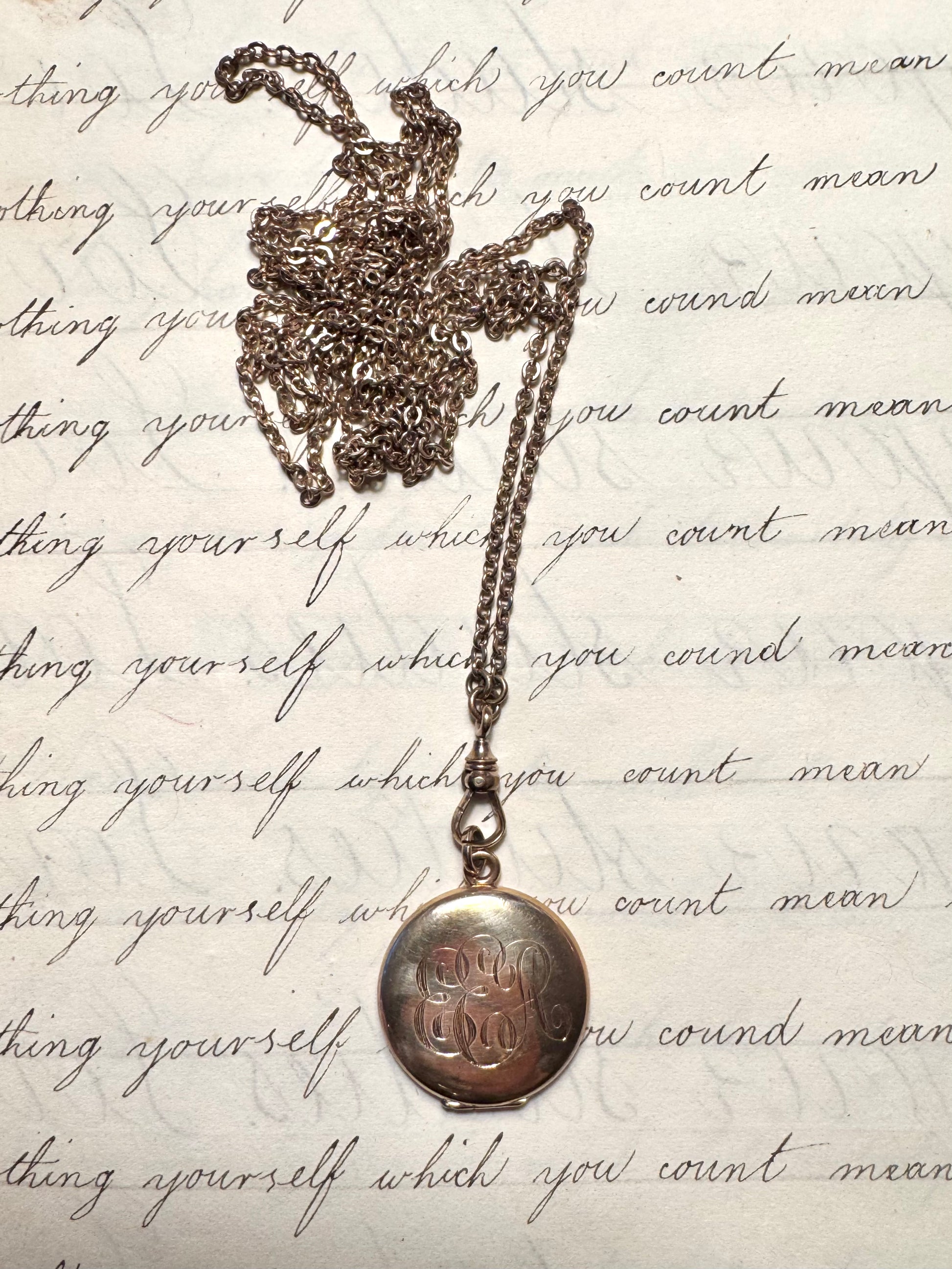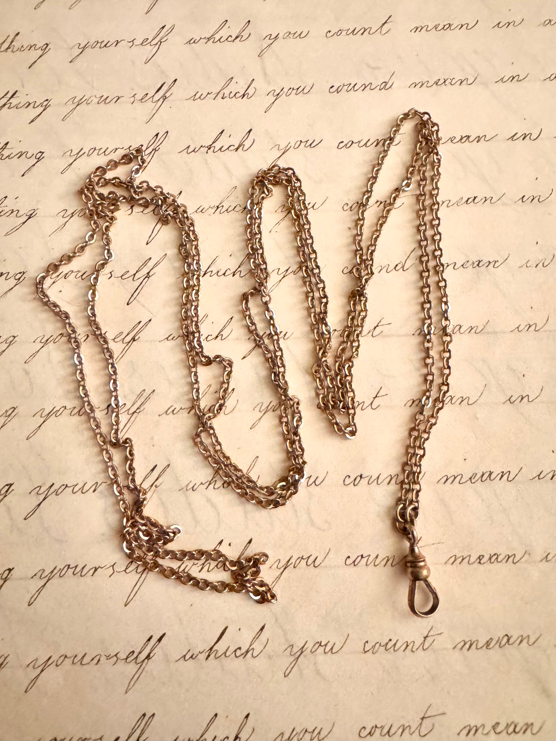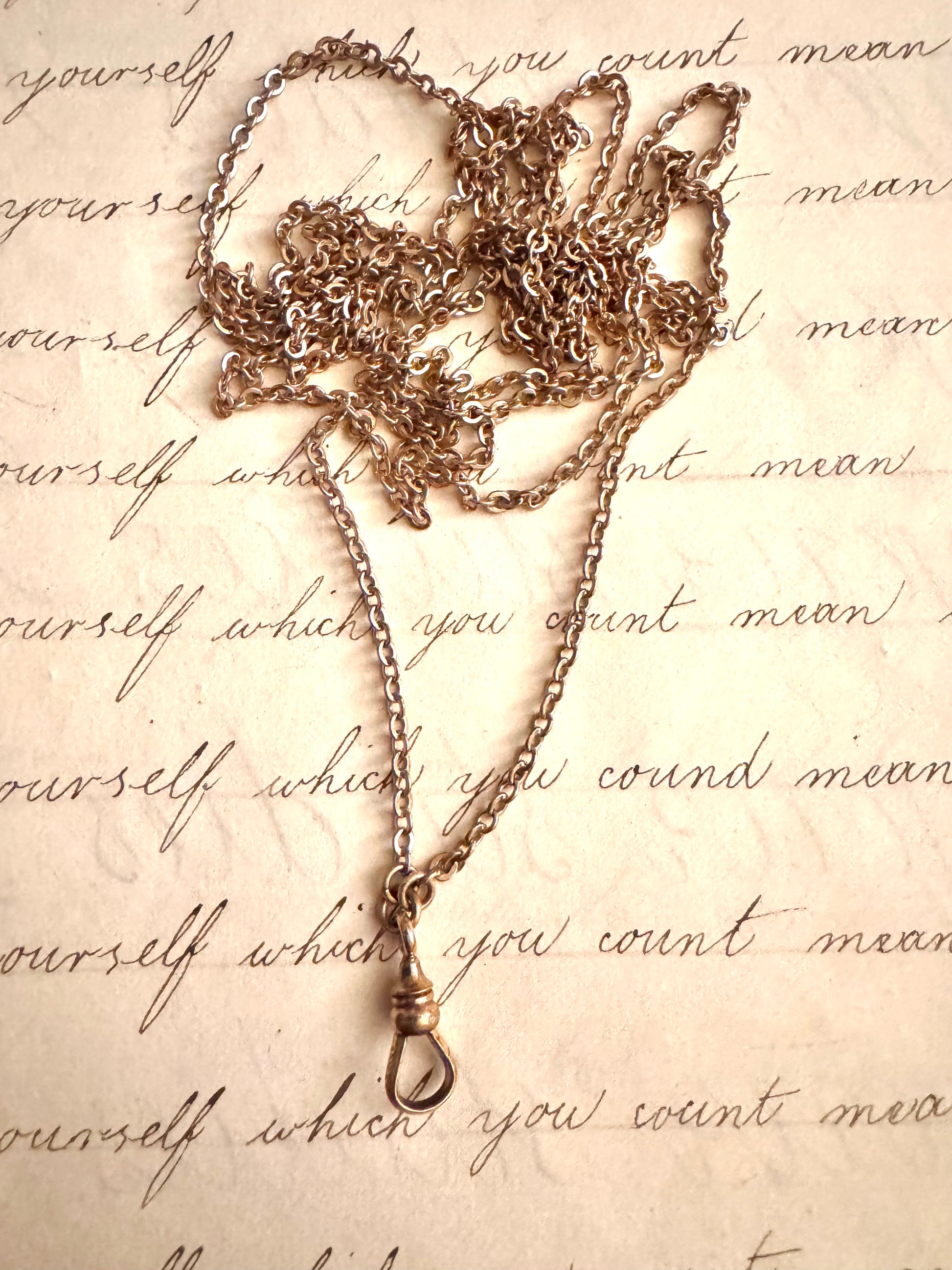50” long antique gold filled fine rollo chain with dog clip. In excellent condition. Marked D & G on the clasp. Weighs 11.64 grams