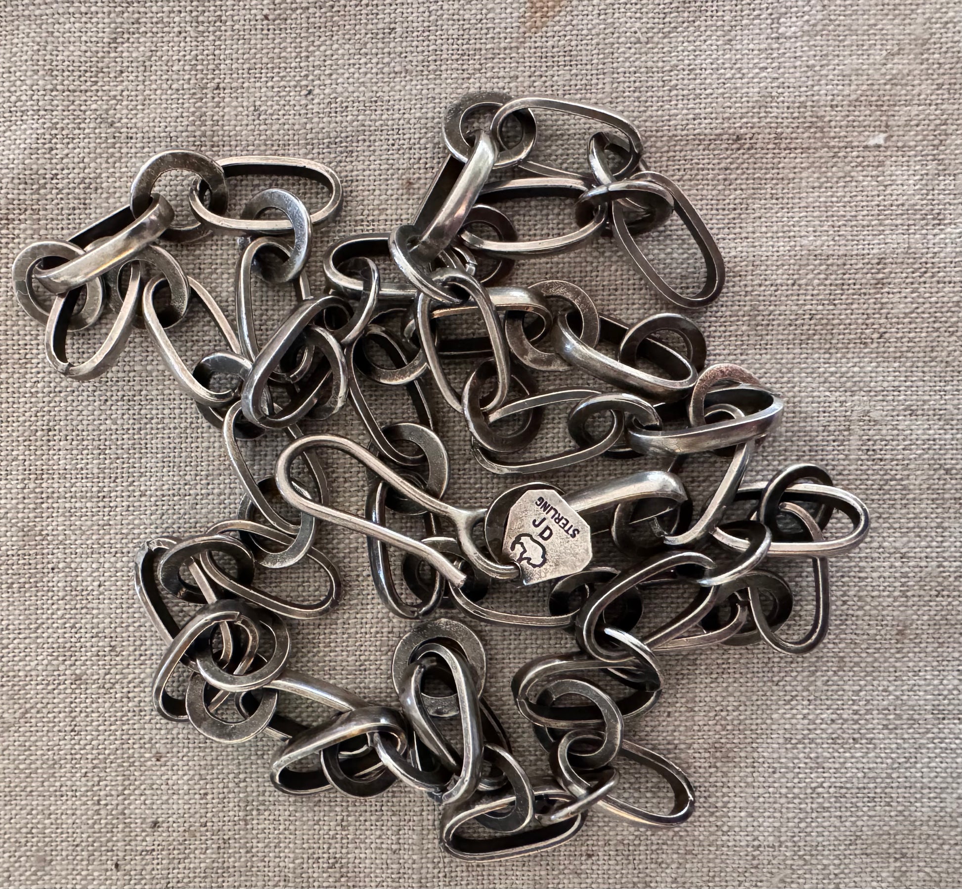 A completely hand forged and handmade sterling silver chain with a hang tag with the makers mark “JD” and a buffalo. Also marked Sterling. 38” long with a hand forged hook closure that can be sued for hanging a pendant or hooking into a link anywhere on the chain. Each link is hand formed and soldered. The weight is 132.9 grams