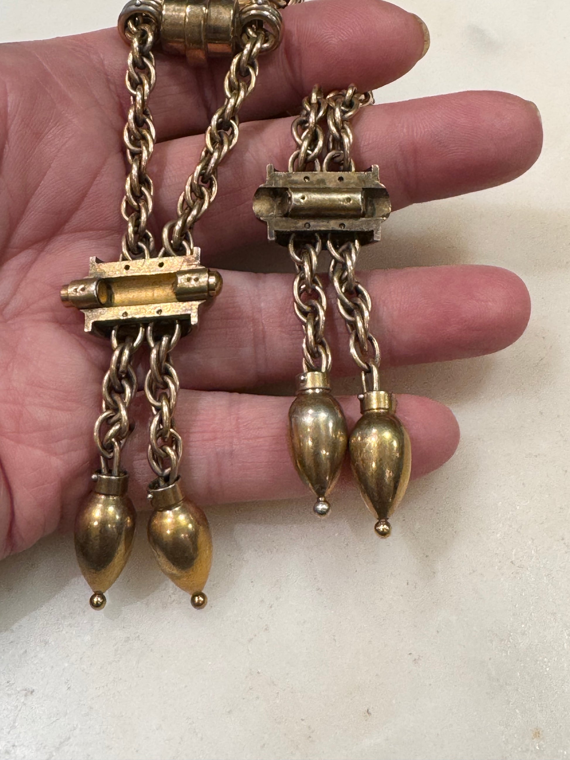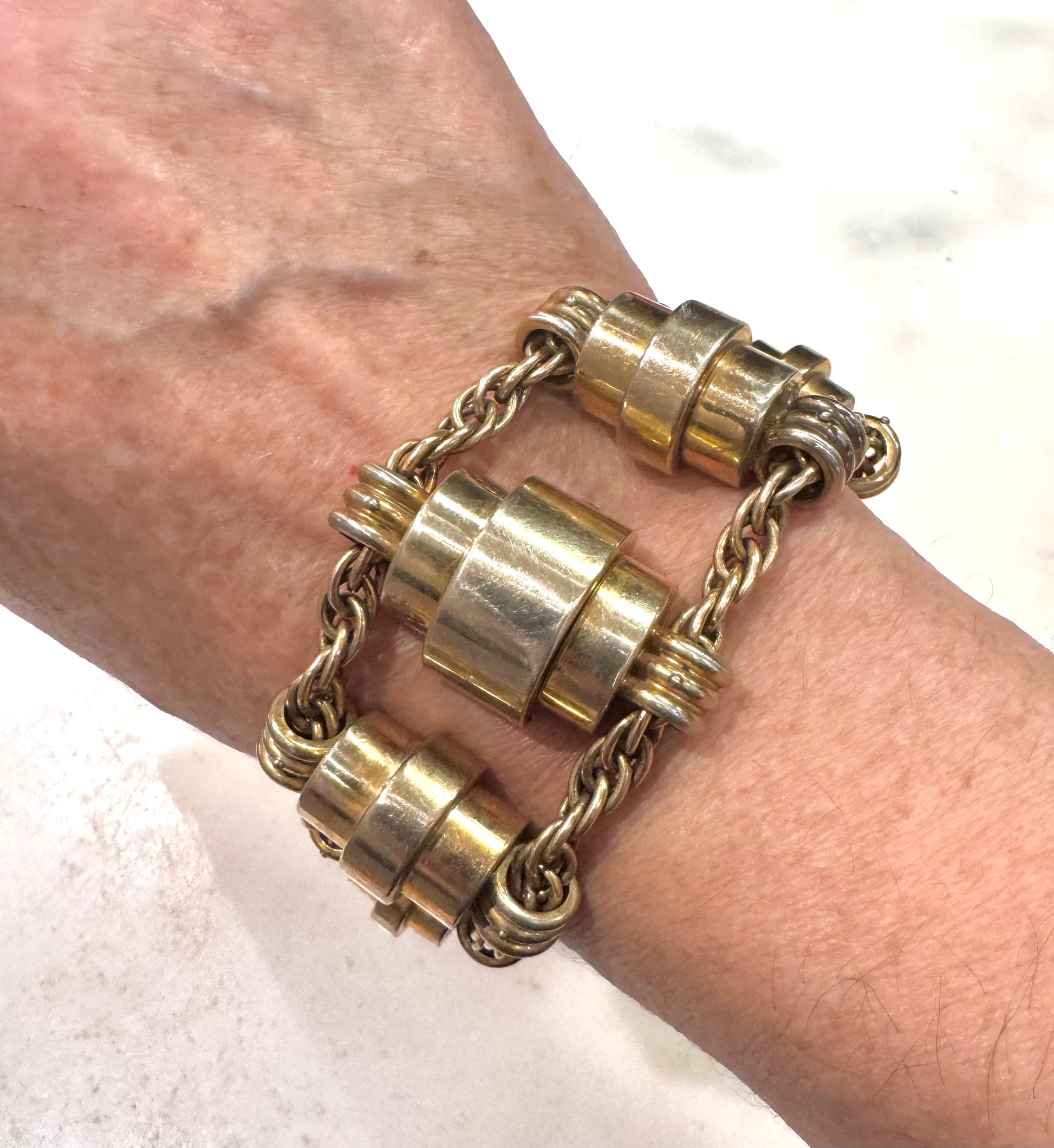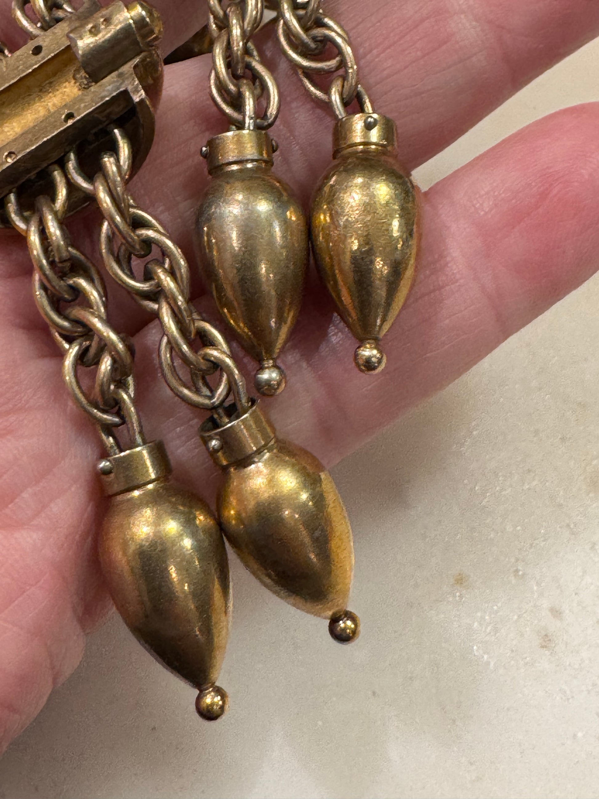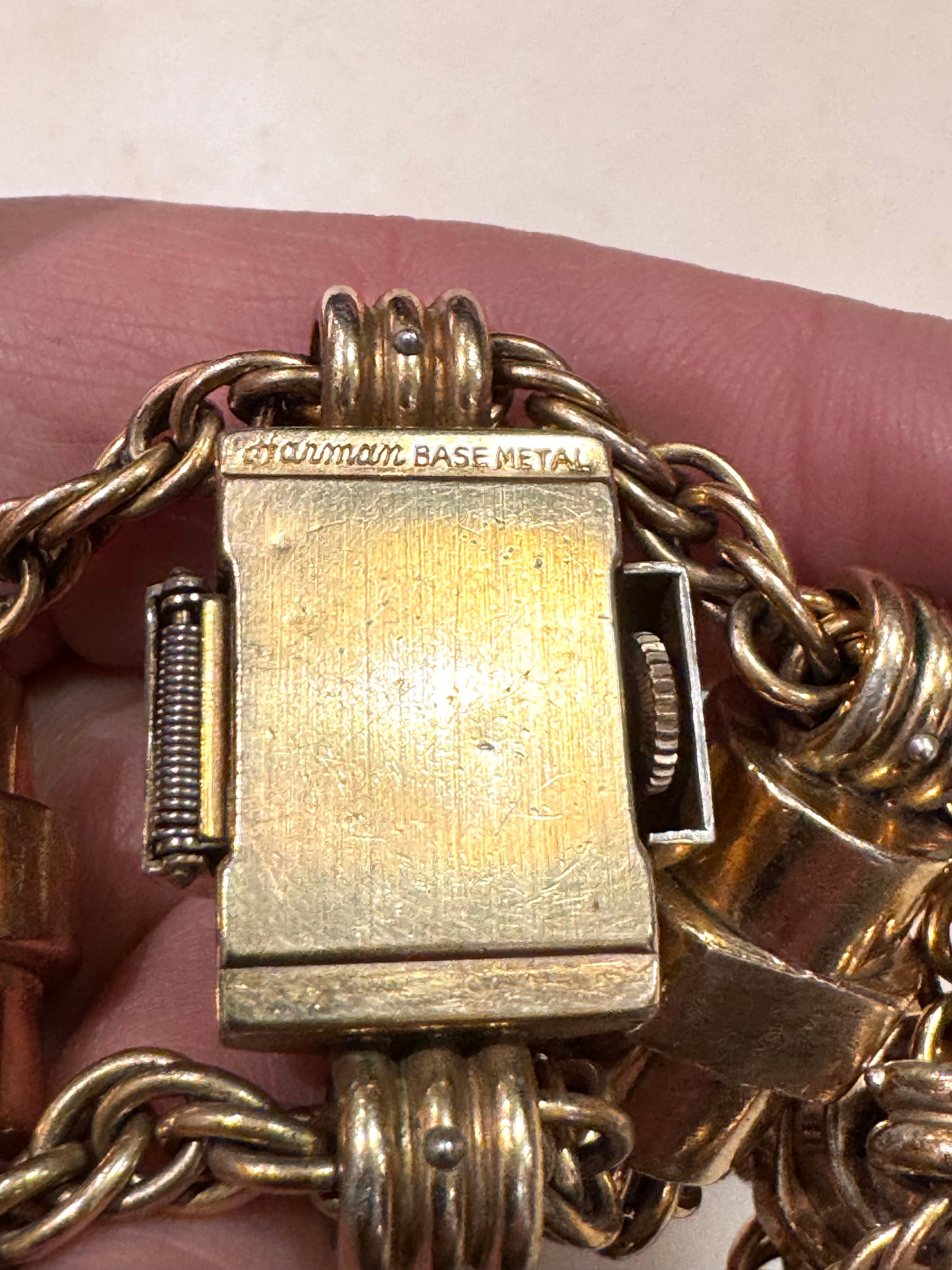 an amazing rare watch bracelet said to be a copy of a Mauboussin piece. The watch is disguised as a link of the bracelet. The clasp is magnetic and works perfectly with a strong closure. The bracelet section measures 7 1/4 inches and the tassel dangle is 2 inches long. The watch works and maintains perfect time. in excellent condition for its age - it was made in the late 1940s. Gold plated brass