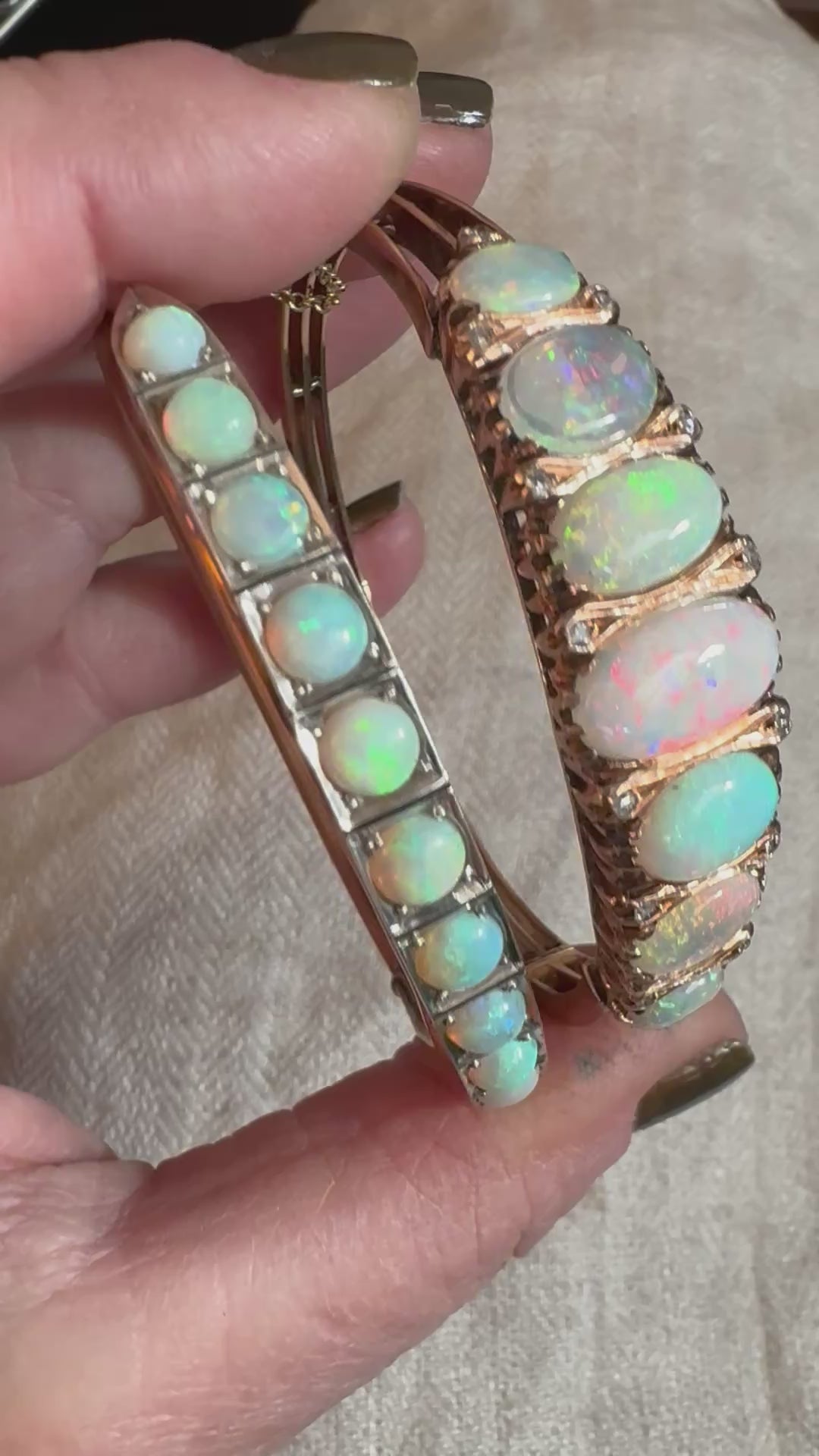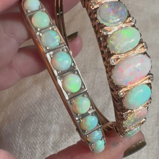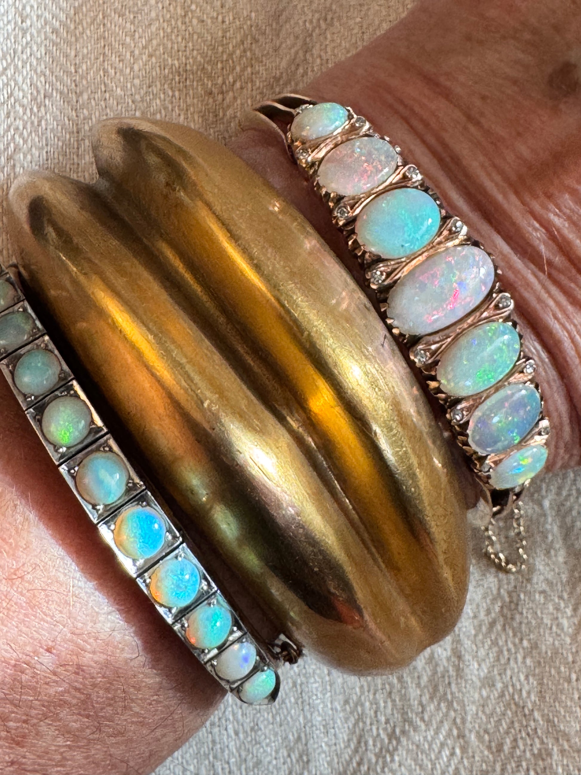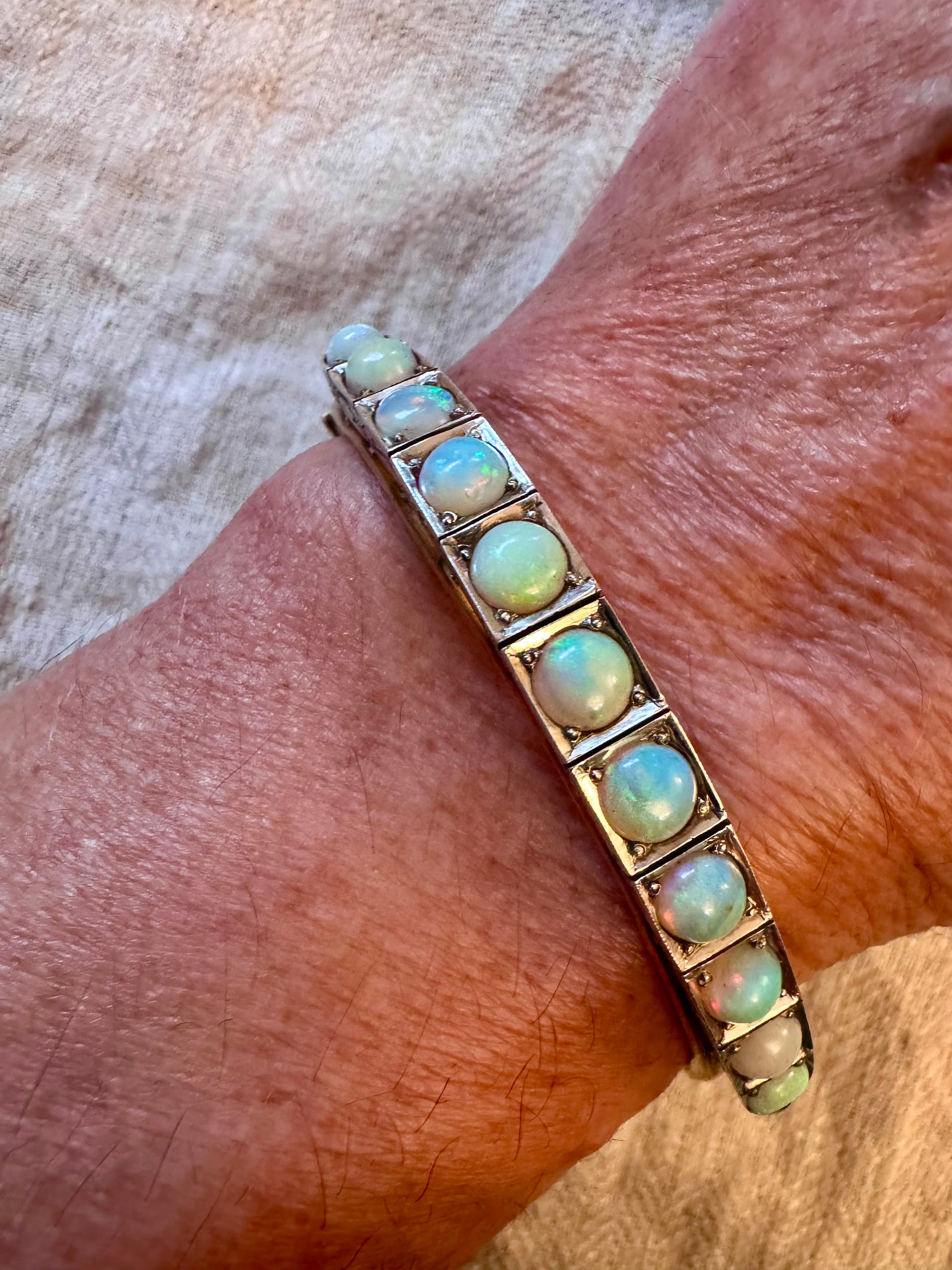 A lovely bracelet with glow in the dark opals set in sterling silver. The silver settings are hand engraved along the sides and set onto a gold filled hinged bangle. The opals are solid stones, not backed in matrix. The bracelet weighs 17.85 g and measures 2 1/4“ x 2“