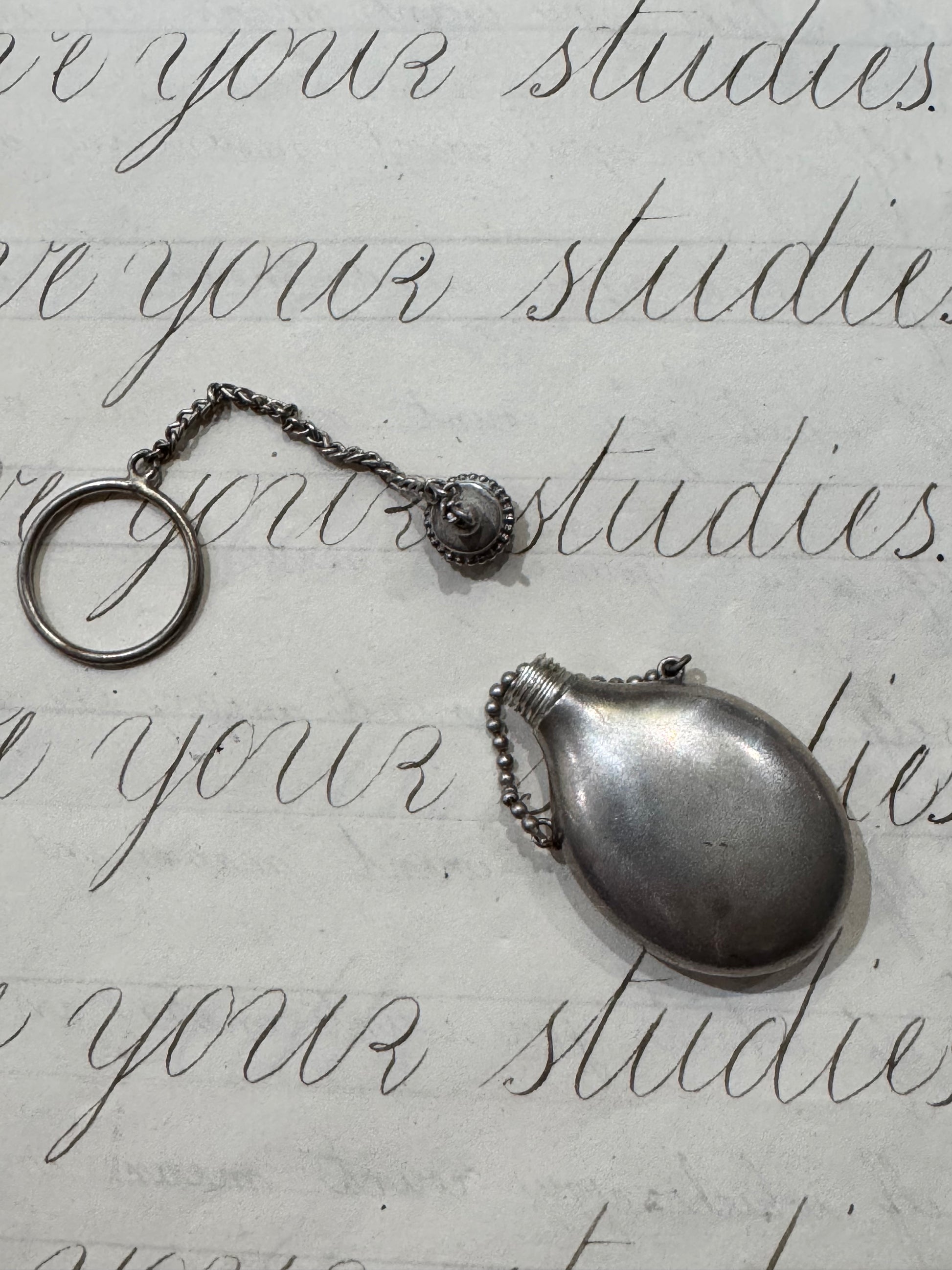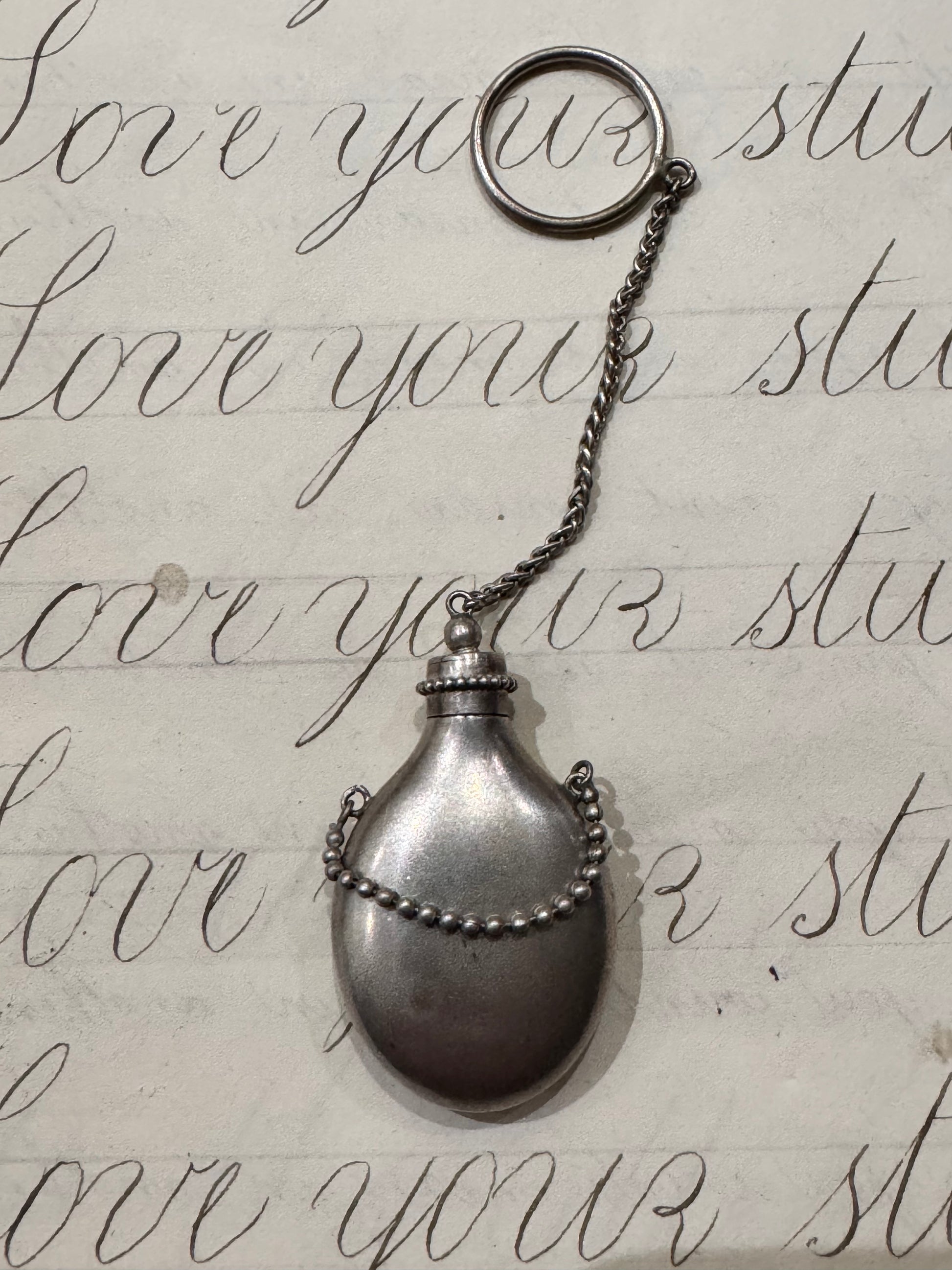 silver Victorian perfume bottle from Norway. With a chain and ring this was carried in the palm of a hand, possibly with the ring worn on a finger. The bottle measures 2 inches and the chain measures 3 inches so together it is 5 inches long. 12.16 g.