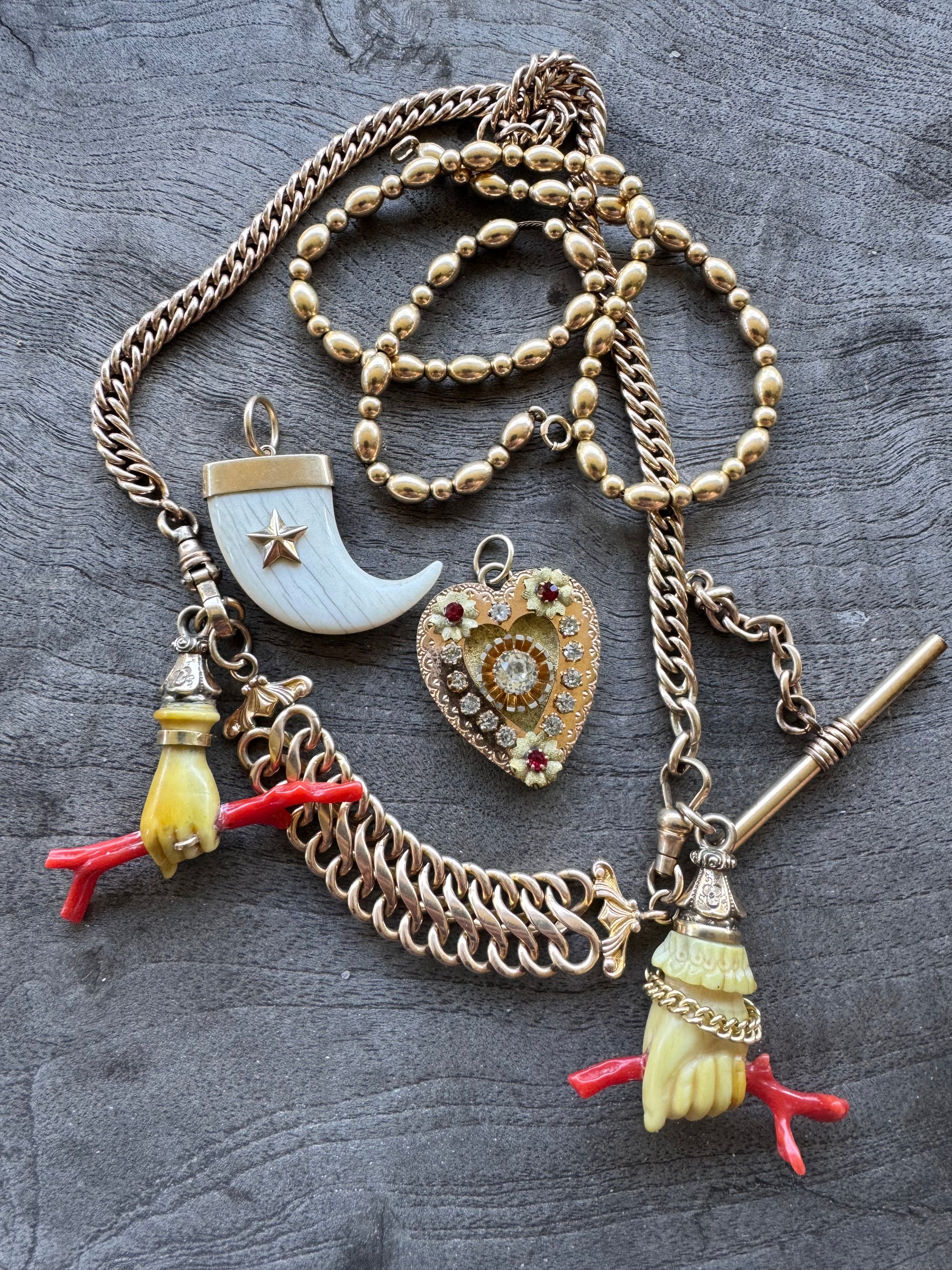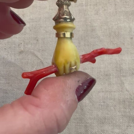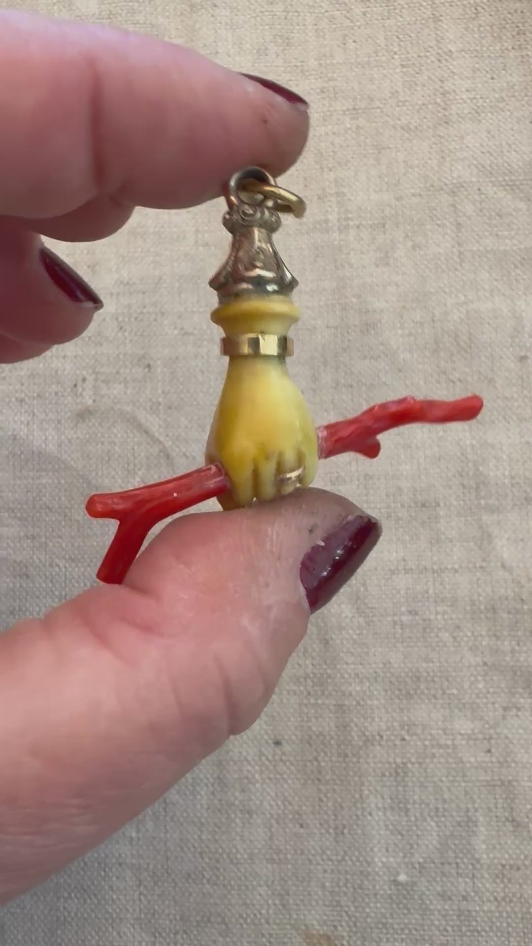 Antique hand carved bone hand with a coral staff and 14k gold decorative top, cuff bracelet and ring. Measures 1-1/2” tall including ring