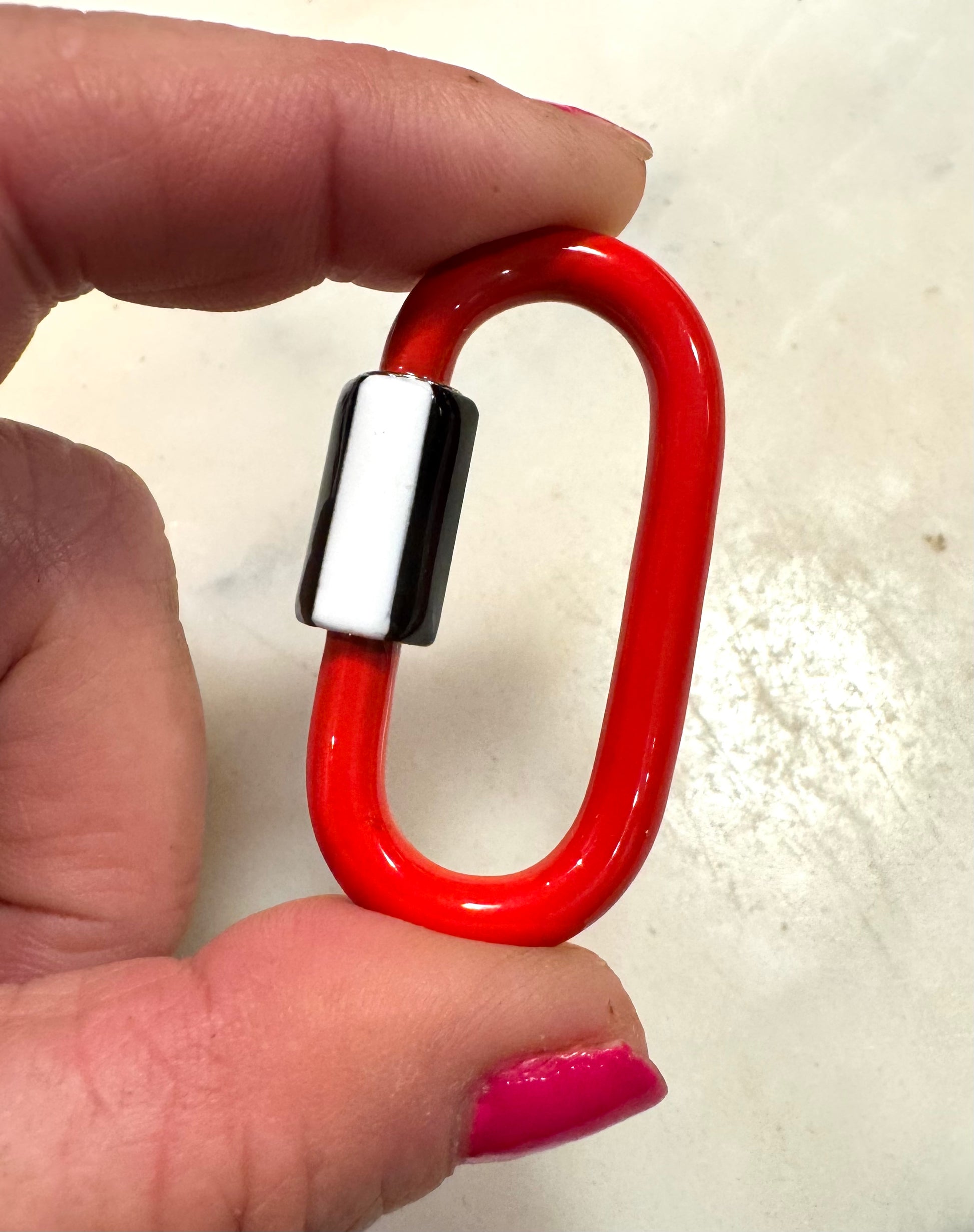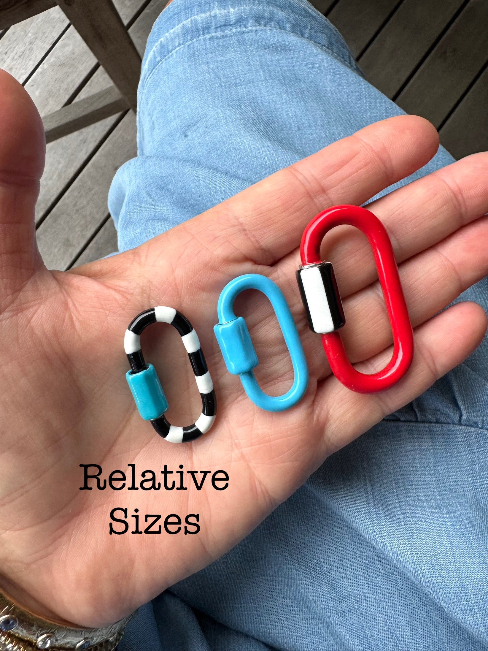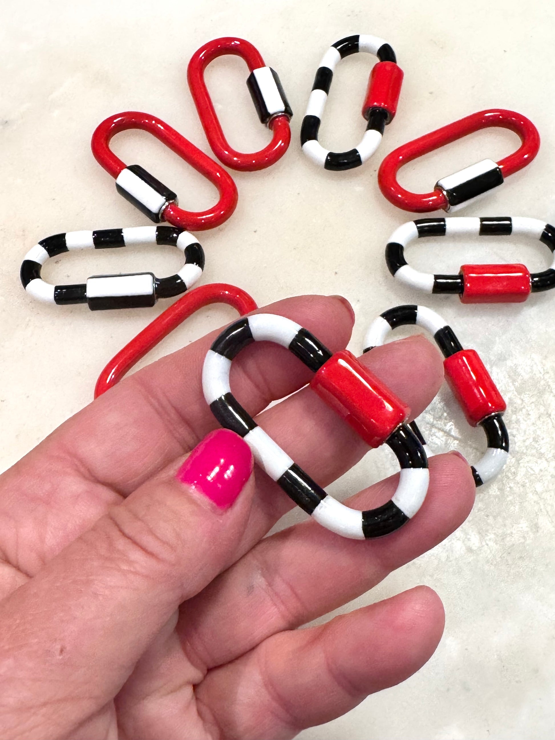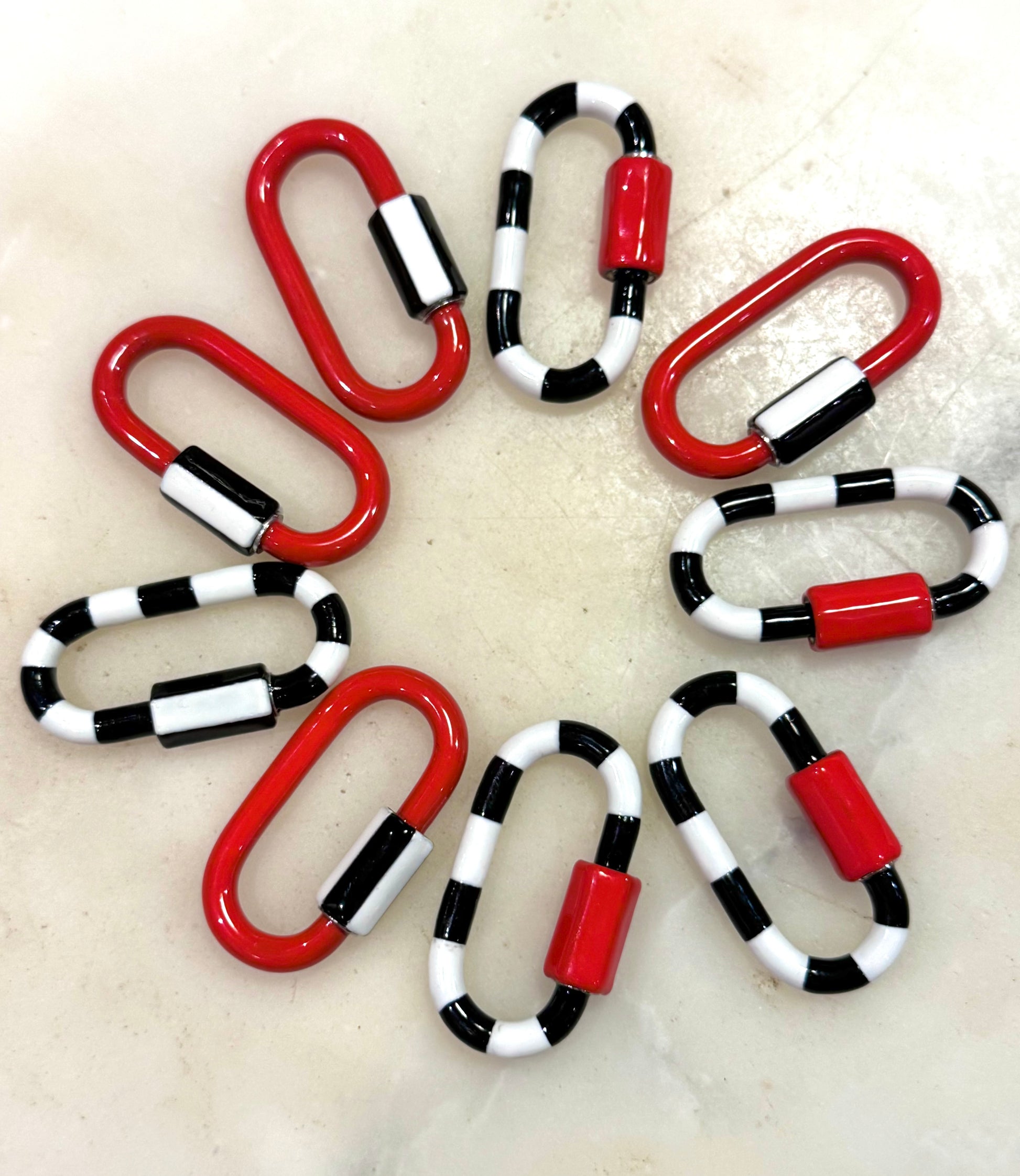 Hand enameled Quick Screw connectors - durable enamel applied by hand in my New York enamel studio over high quality carbon steel. The Memphis design aesthetic was popular in the 1980’s and originated in Milan, Italy - these quick screws reflect the Memphis style with lots of bold black and white with bright color accents. Each large size Quick Screw measures 2” by 1-1/8”