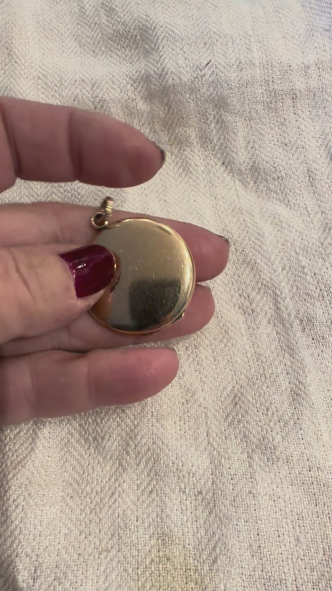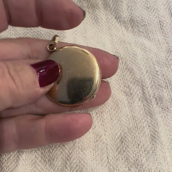 A perfect, plain un-engraved round locket, cased in 14 karat gold. Measuring one and 3/4 inches tall, including the bail by one and a quarter inches wide and weighing 10.34 g. The locket has both rings on the inside for holding in pictures, but no glass.