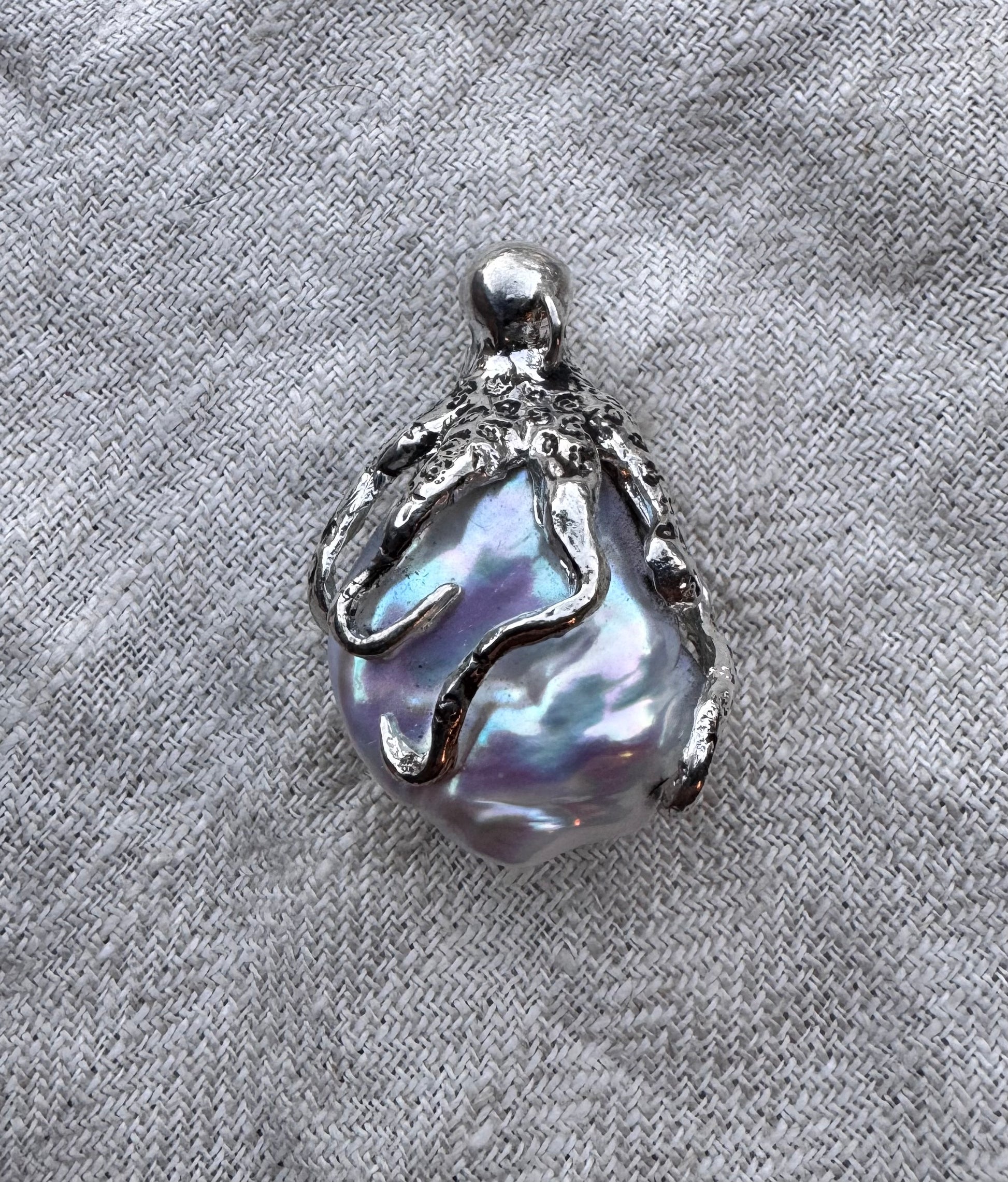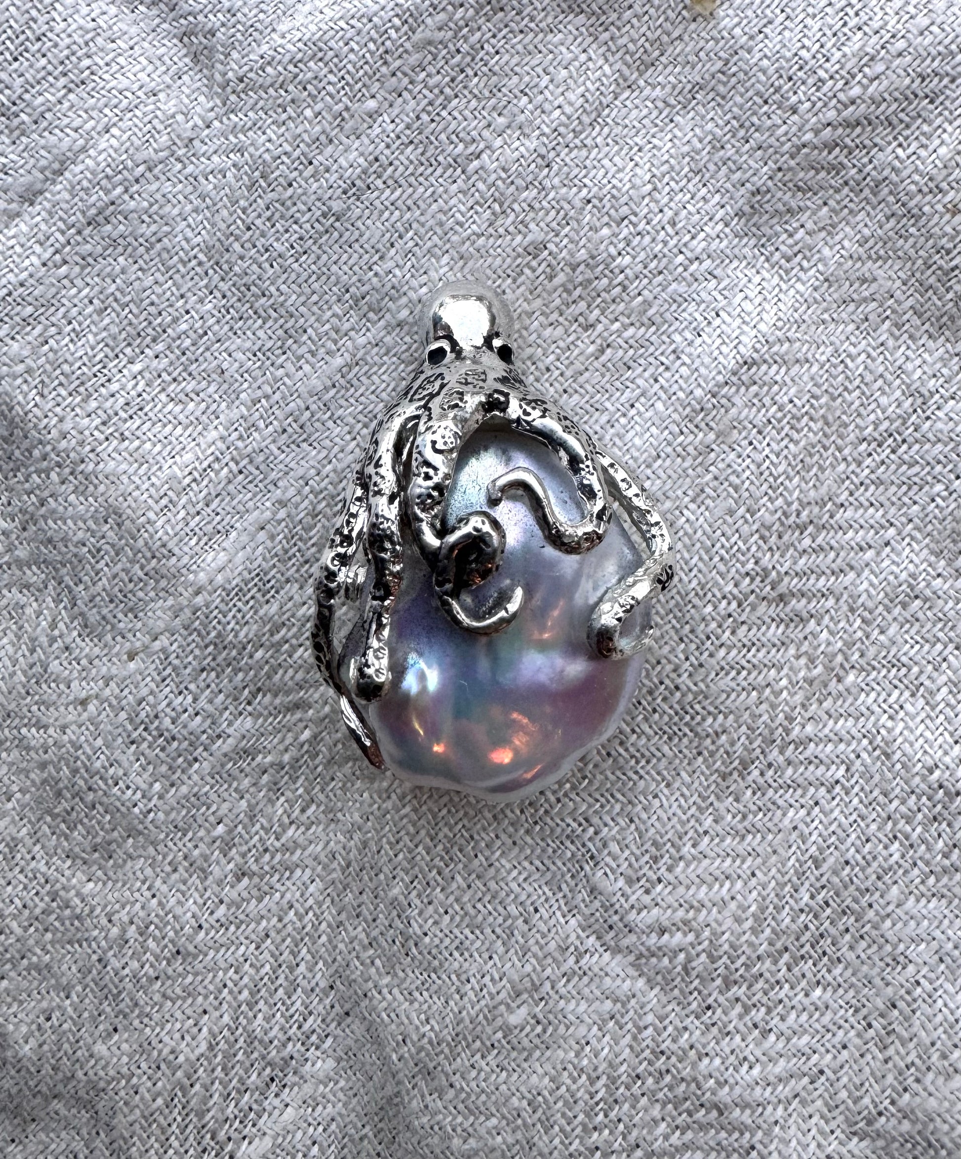 Originally made for my line at Bergdorf Gooman I designed and made this octopus to hold all kinds of things. This version is guarding an enormous freshwater pearl. The sterling silver octopus without the pearl weighs 17 grams and the total length of the pendant is 48mm. I sometimes added rubies or diamonds to his eyes…if you buy this piece I can add your choice of stones for an additional charge - just email me. This listing is for the pendant only. He does not come with the chain.