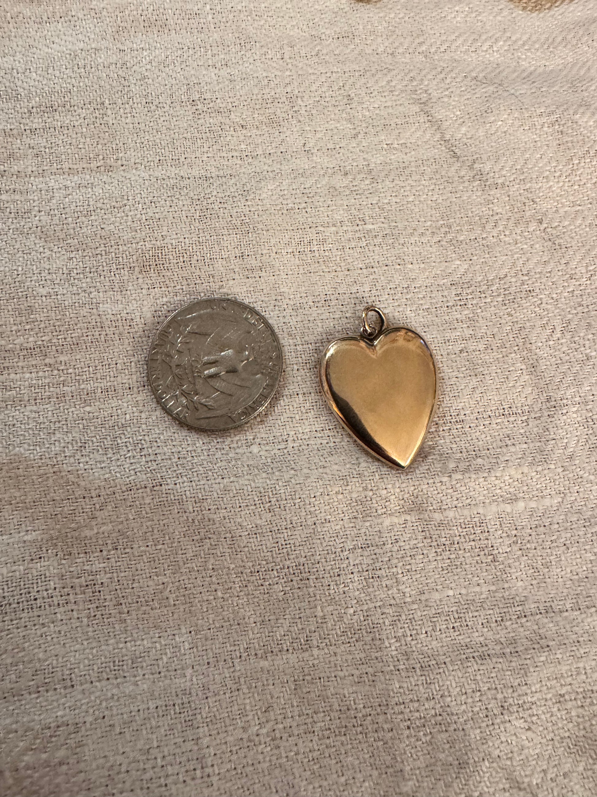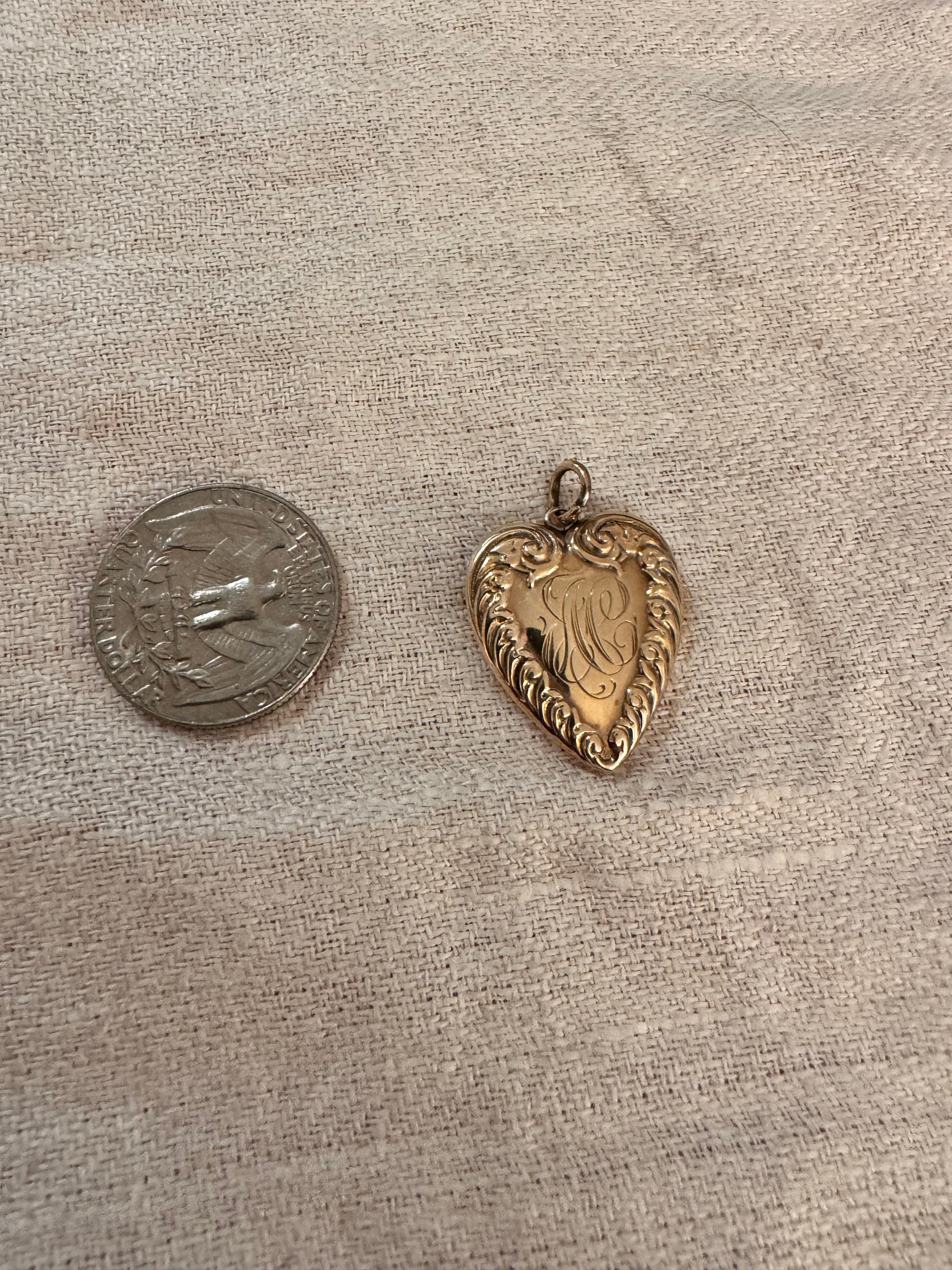 Perfect semi solid (but not cased or gold filled) 10 karat gold puffy heart pendant with beautiful patina and rich color. it is engraved with a monogram that appears to be MC and is surrounded by a repousse scroll pattern. The reverse is plain. The pendant measures 30 mm including bail by 23 mmwide. It weighs 4.28 grams.