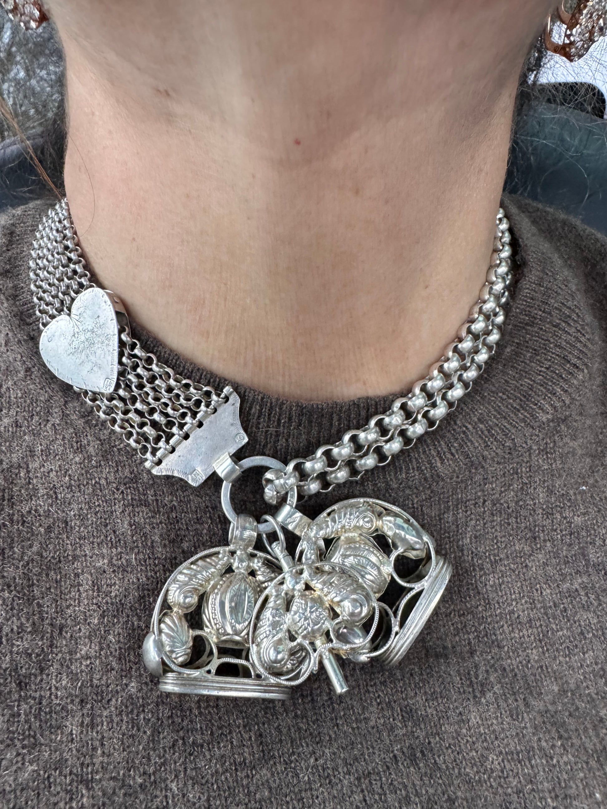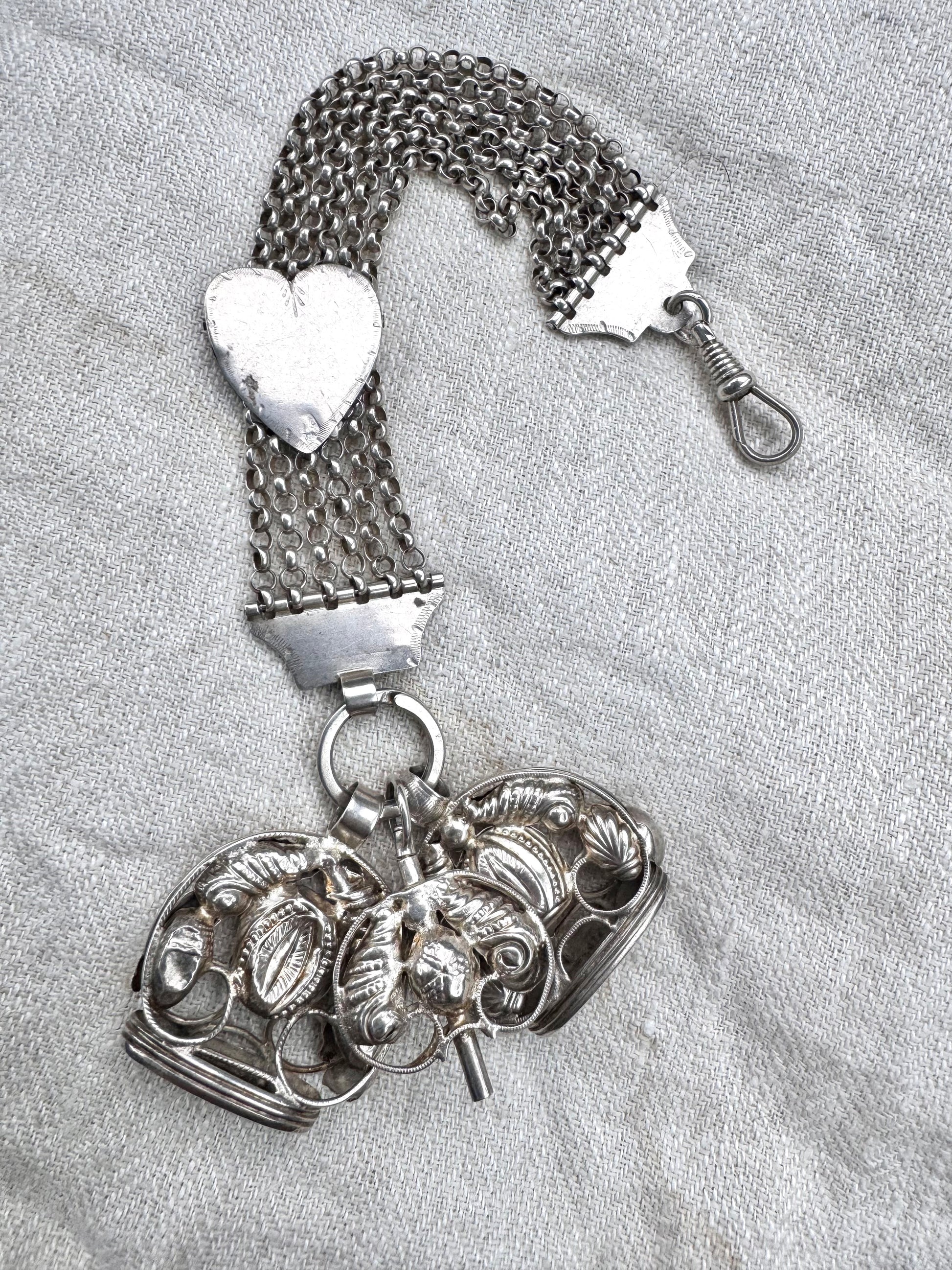 absolutely incredible antique Dutch watch fob chain has Dutch markings on all the pieces, has a silver split ring also marked and two ornate seals one of which is engraved with the letters IVDH on the bottom. There is also a matching watch key. The piece, including the dog clip at the top and the charms hanging from the bottom measures 9 inches. It weighs 40.76 g. It can be worn in a variety of different ways, including as a necklace hanging from a chain or as a bracelet.