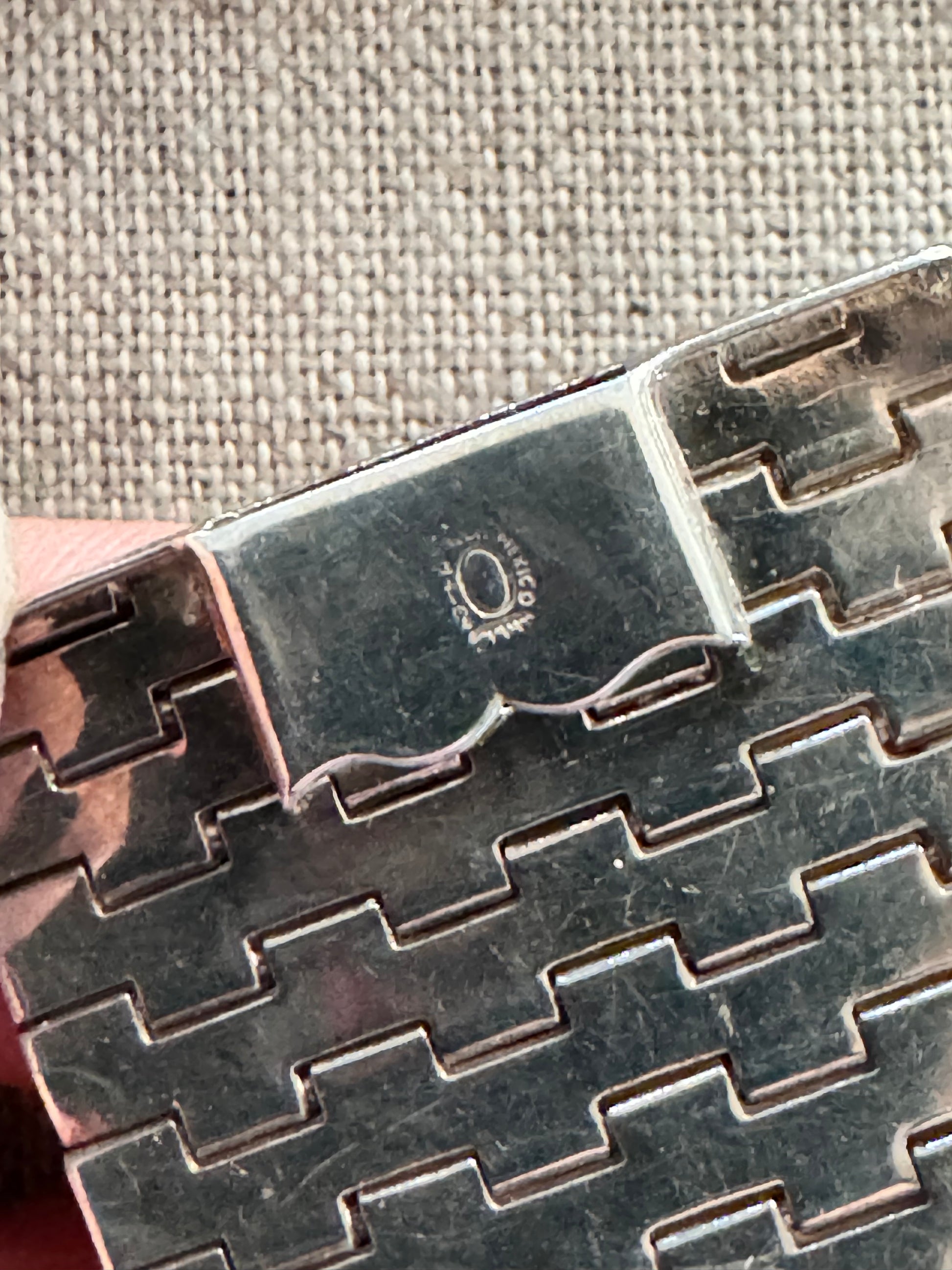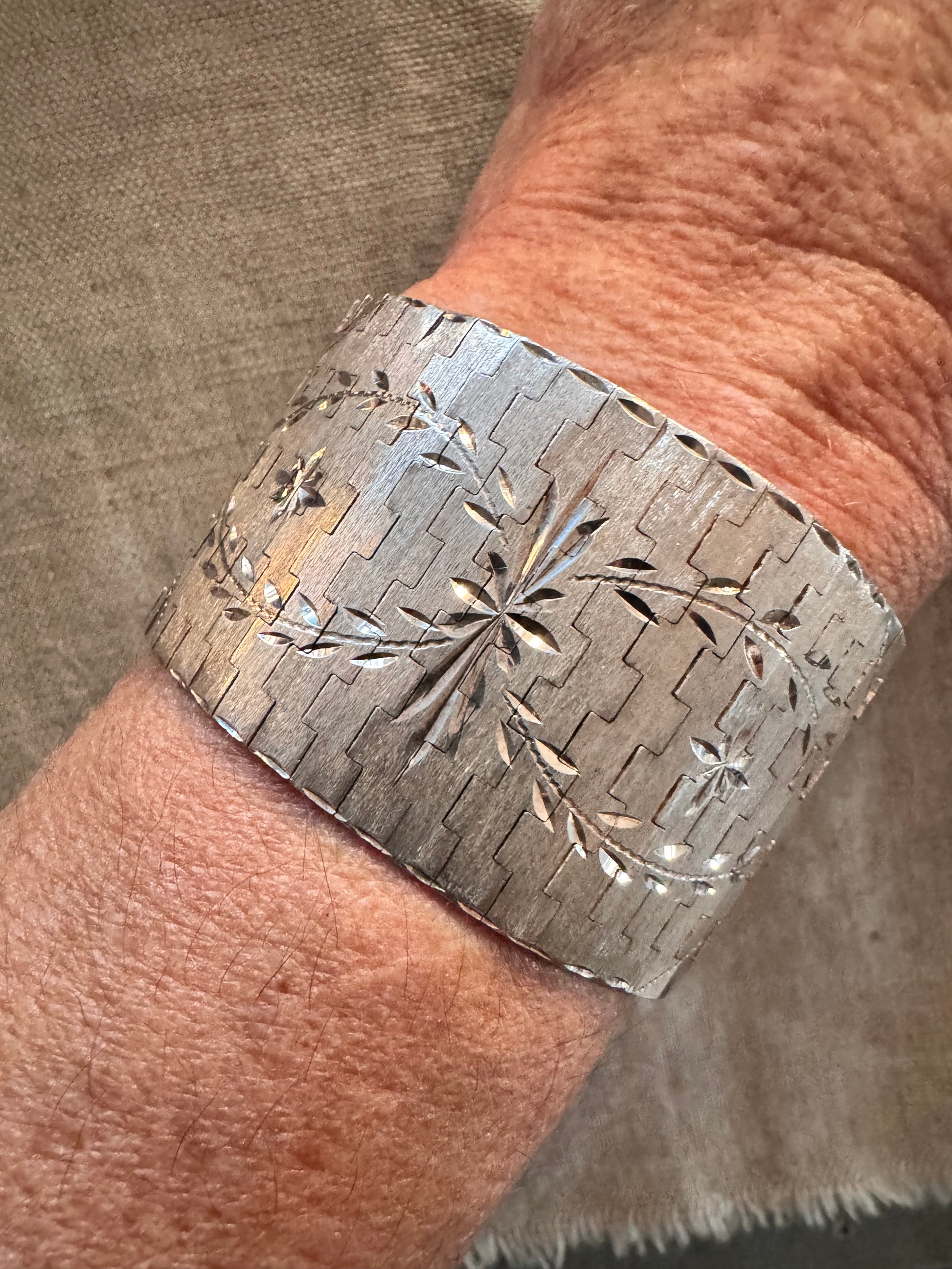 This very unusual vintage Mexican sterling silver bracelet is striking and makes a wonderful statement. The bracelet measures 7 inches long by one and a half inches wide and has a sturdy bayonet clasp with two safety catches. The front of the bracelet is a combination of engraved and shiny sections, and the back is all shiny. It is hinged throughout and moves in the most liquid way, hugging every curve of the wrist. It weighs 67.8 grams. Marked .975, Mexico and Taxco