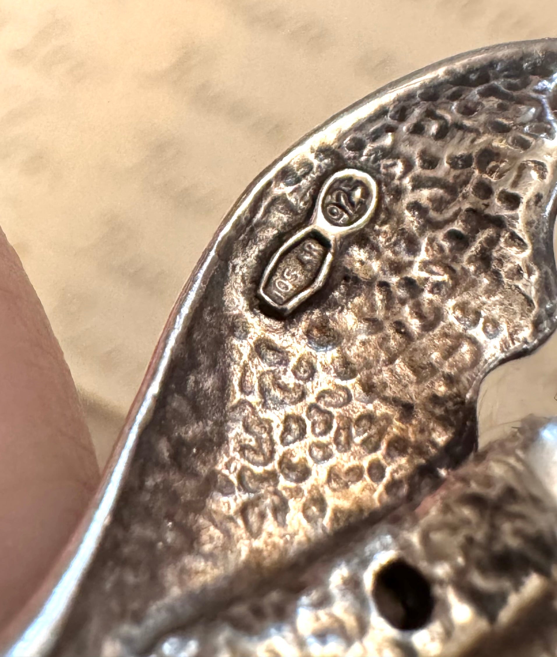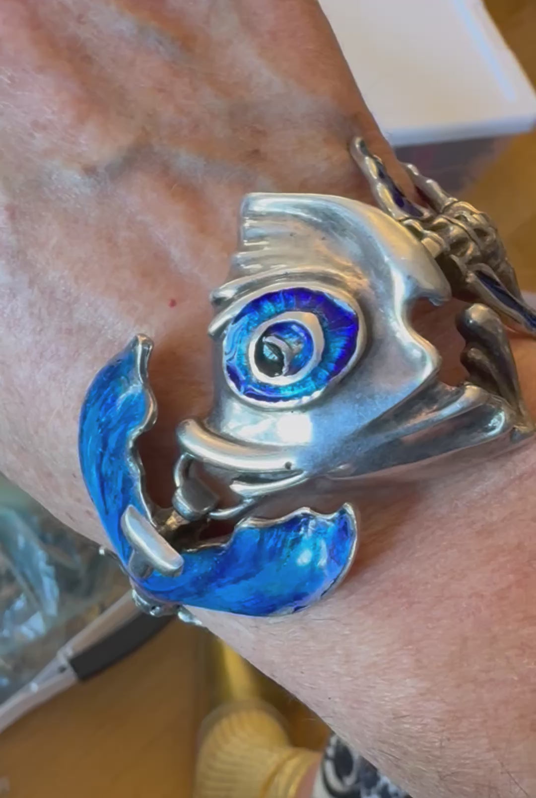 Fantastical sterling silver and blue enamel linked bracelet in the shape of fish bones. completely hand made and hand enamel, this bracelet has an ingenious clasp that works cleverly into the design. The enamel is in perfect condition, the bracelet weighs 75.72 grams and has a wearable length of 8” Marked .925 with a maker’s hallmarks