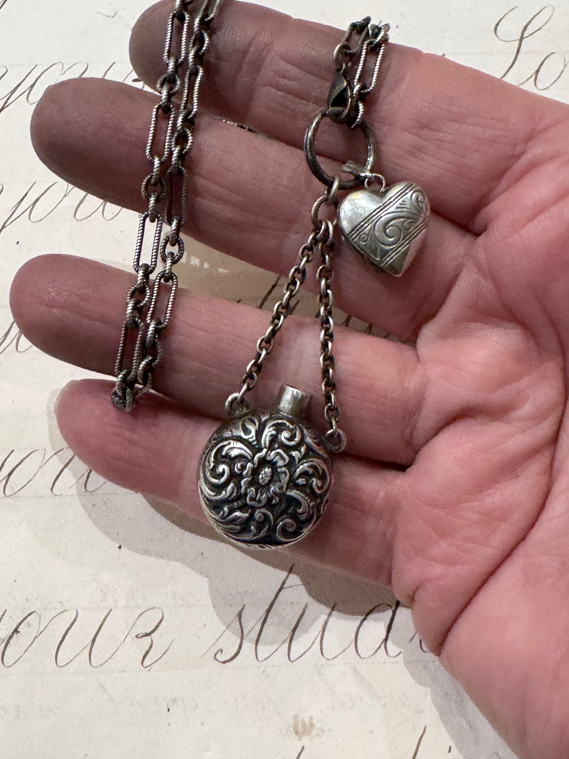 sweet Sterling silver chain with chased bottle and engraved miniature heart locket