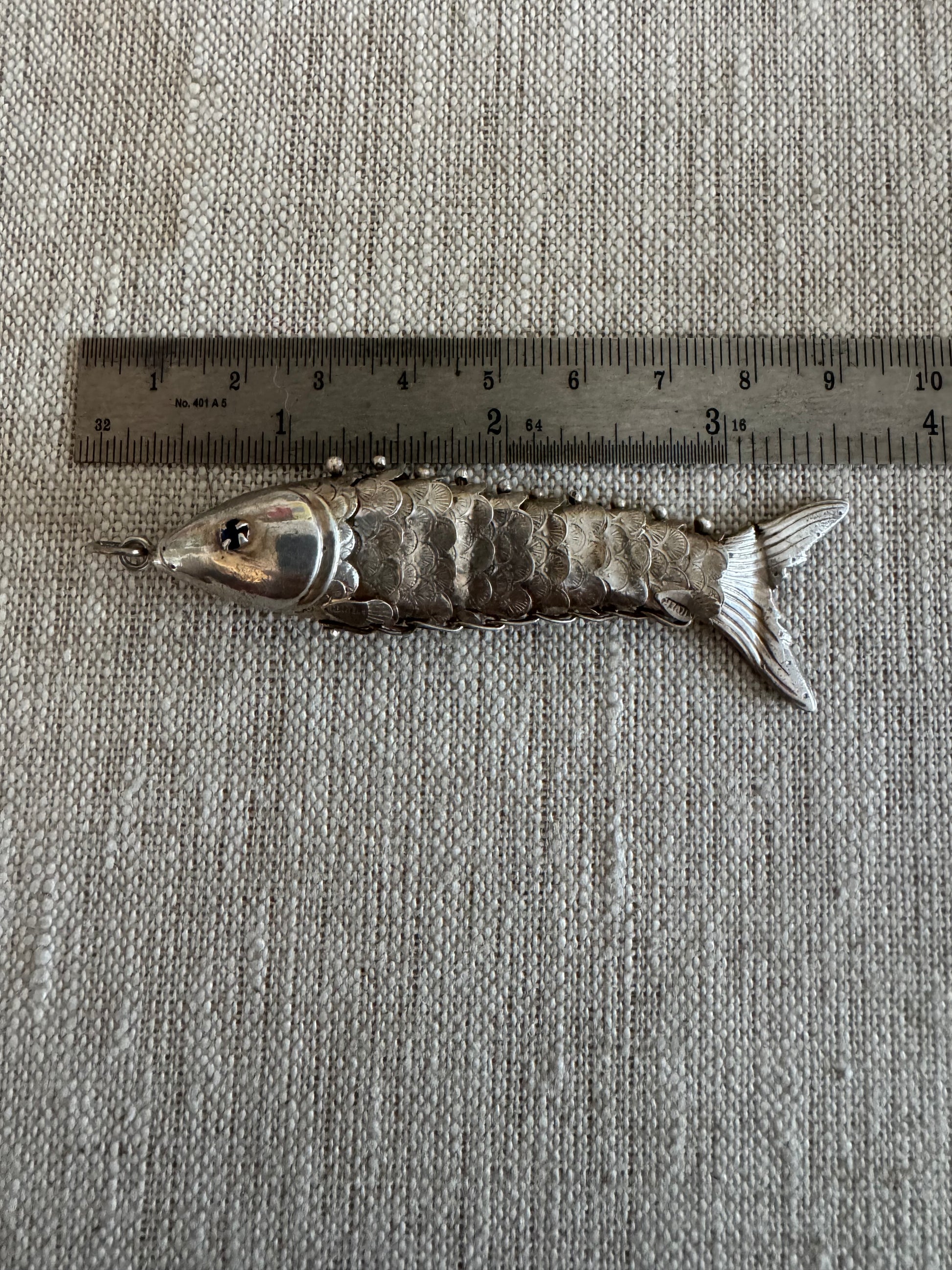 Very large fully articulated antique silver fish with blue eyes and detailed engraved scales. measures 3 1/4 inches, including the ring he hangs from. marked silver on all 4 fins, weighs 7.89 grams