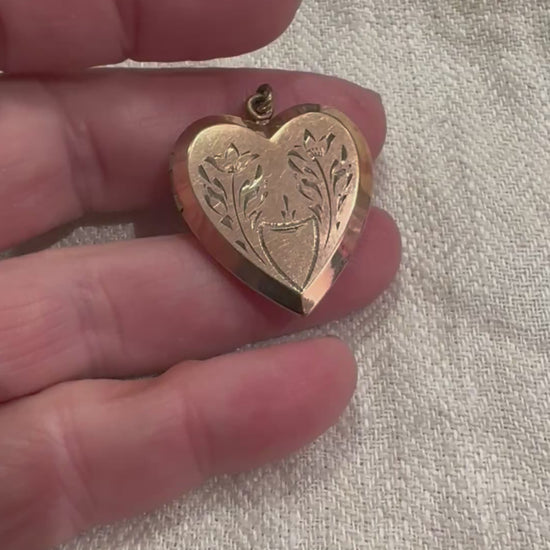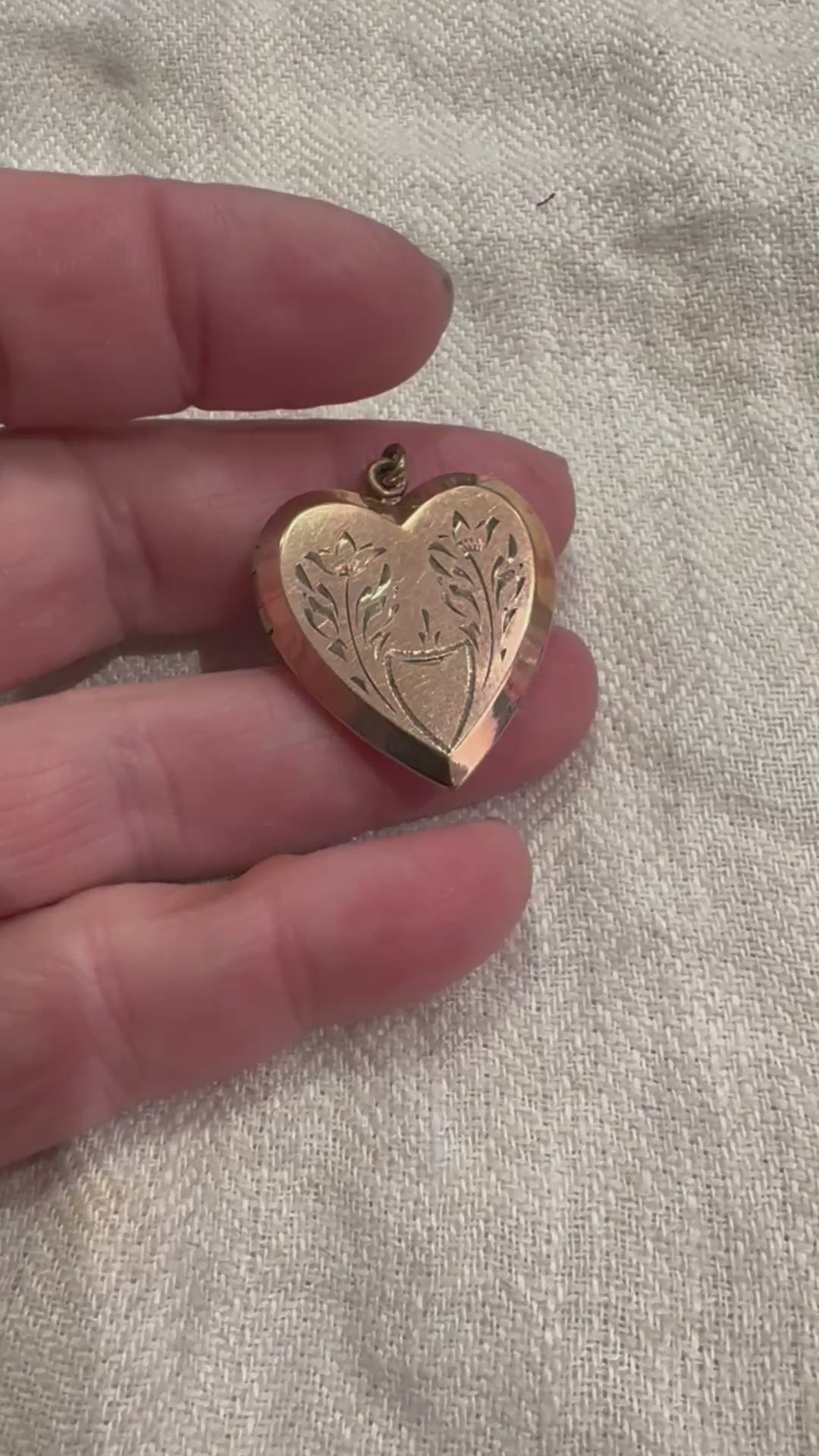 14k rose gold cased heart locket with room for two pictures. The frames are present, but no glass. Hand engraved with a floral pattern on one side and engine turned on the other, the heart measures 1-3/8” tall including the ring by just over 1” wide. It weighs 5.51 grams
